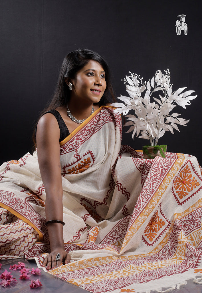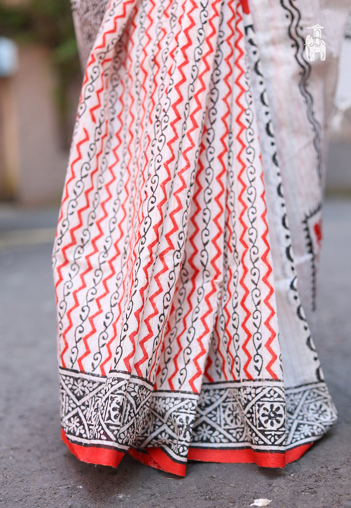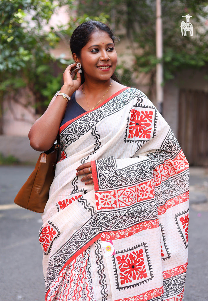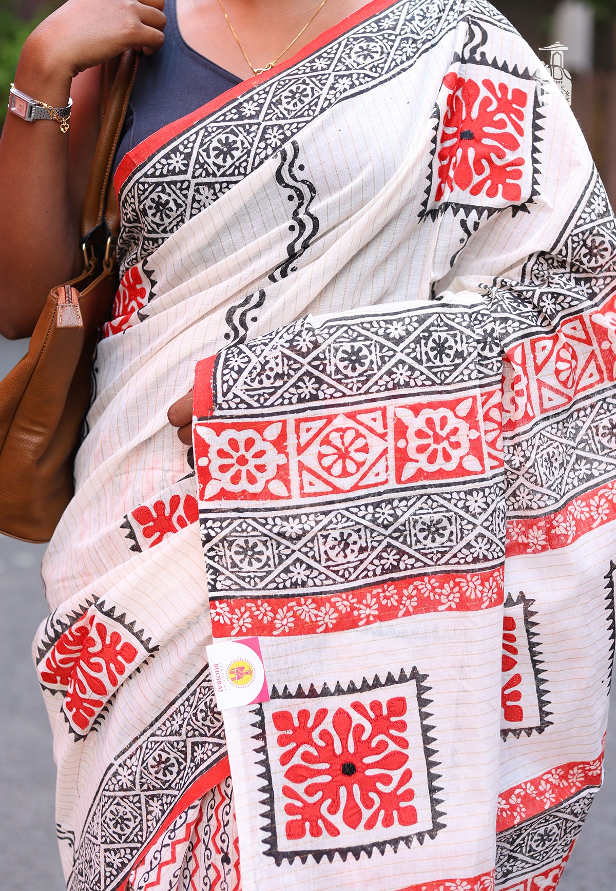 Make your summer colourful with this White Applique Work Saree with Red Border. This cotton fabric saree will be the perfect choice for this hot summer.