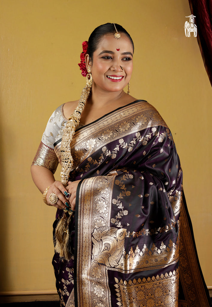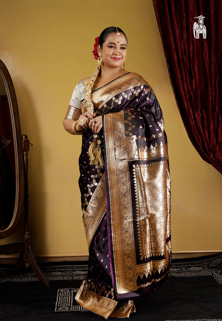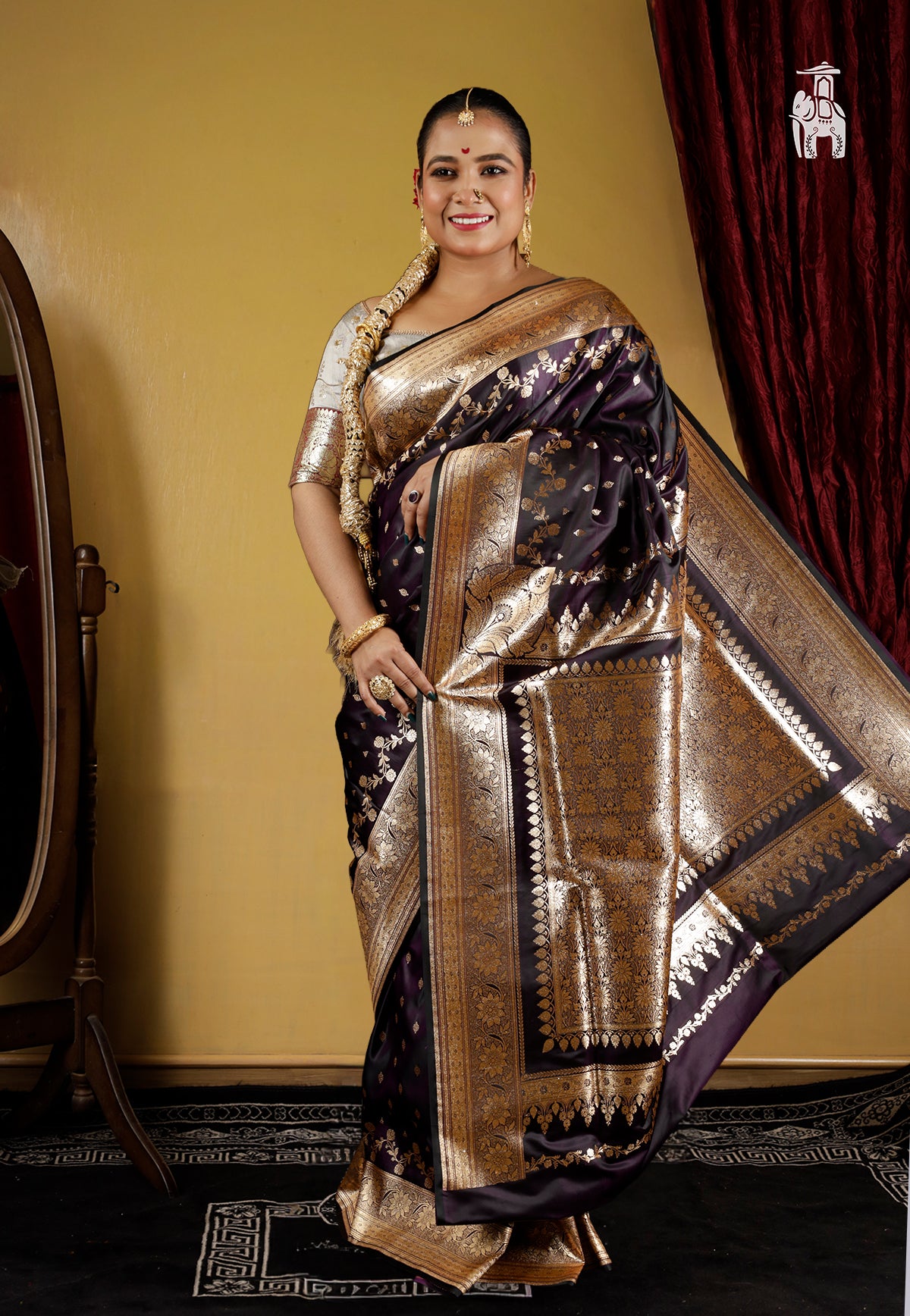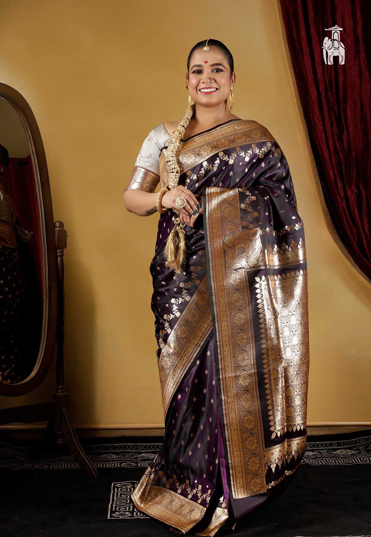 Brighten up your festivities with this Dual Tone Purple Satin Katan Banarasi Saree, an enriched luxury by Legacy of Bhojraj.
