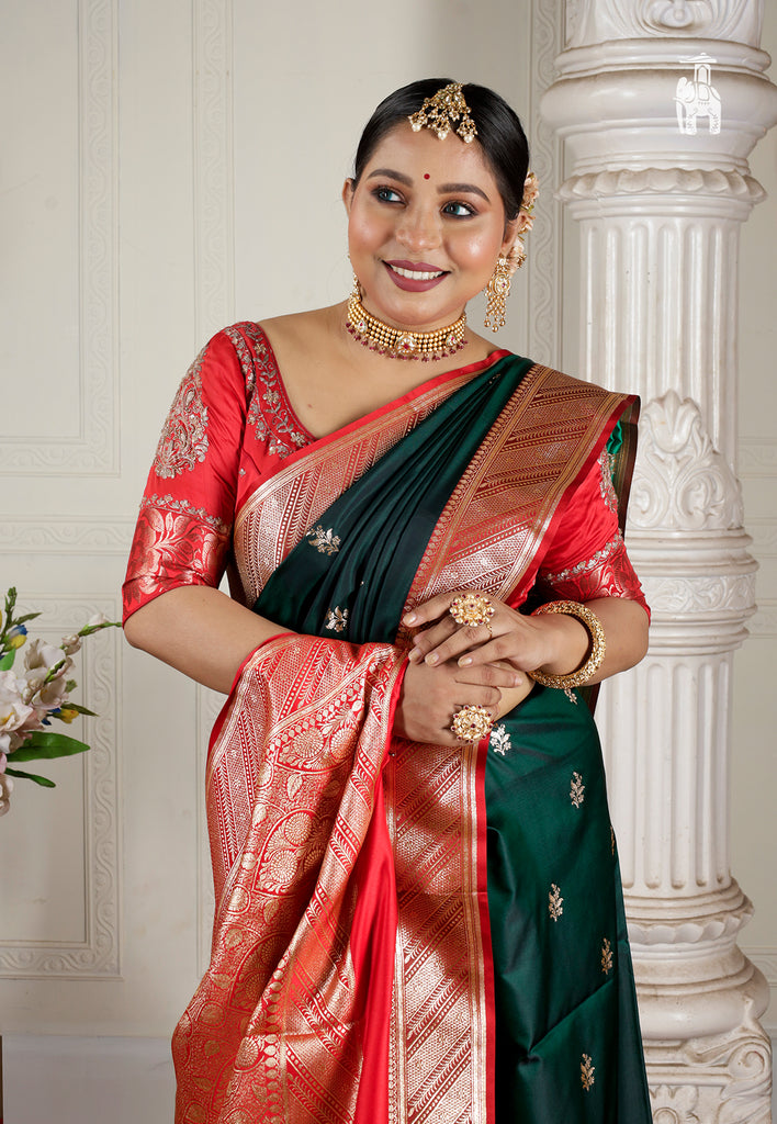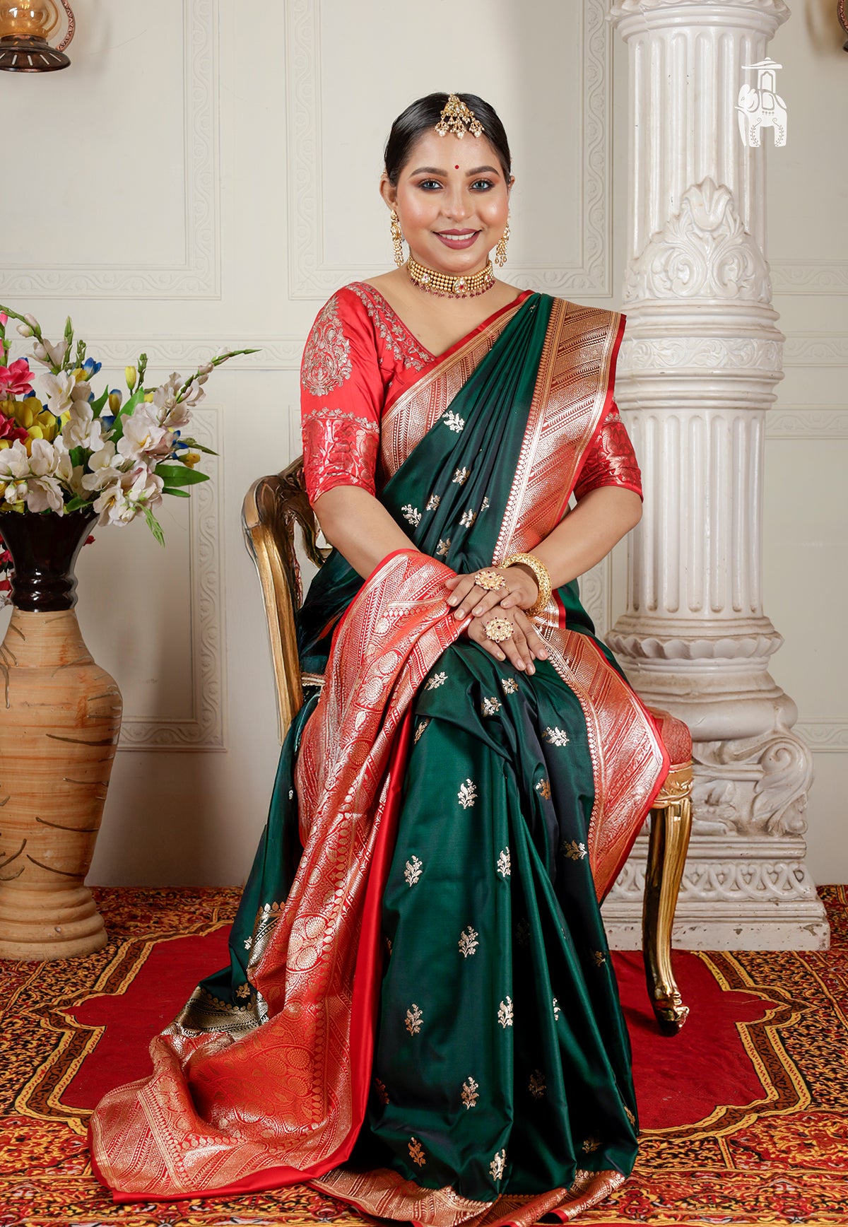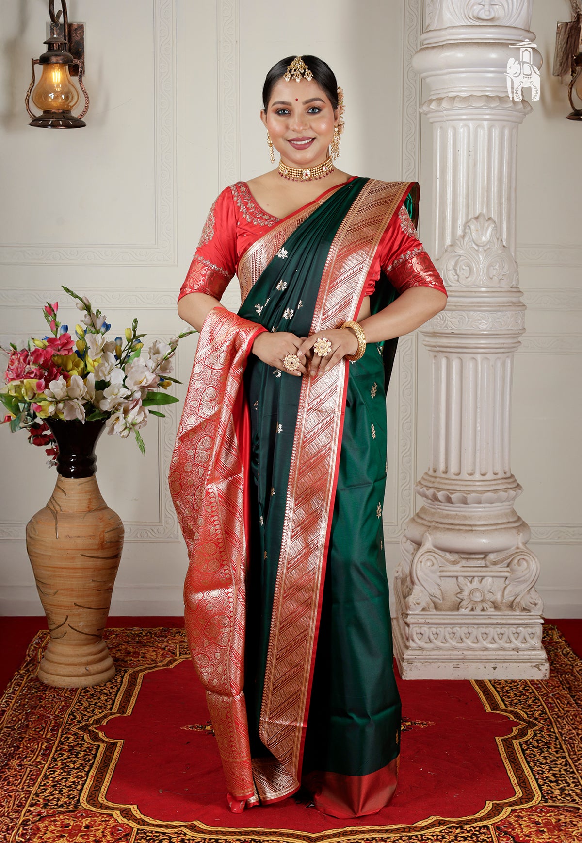 Get your best bridal Mehendi attire in this Green Satin Katan Banarasi Saree, designed specially for bridal rituals & ceremonies.