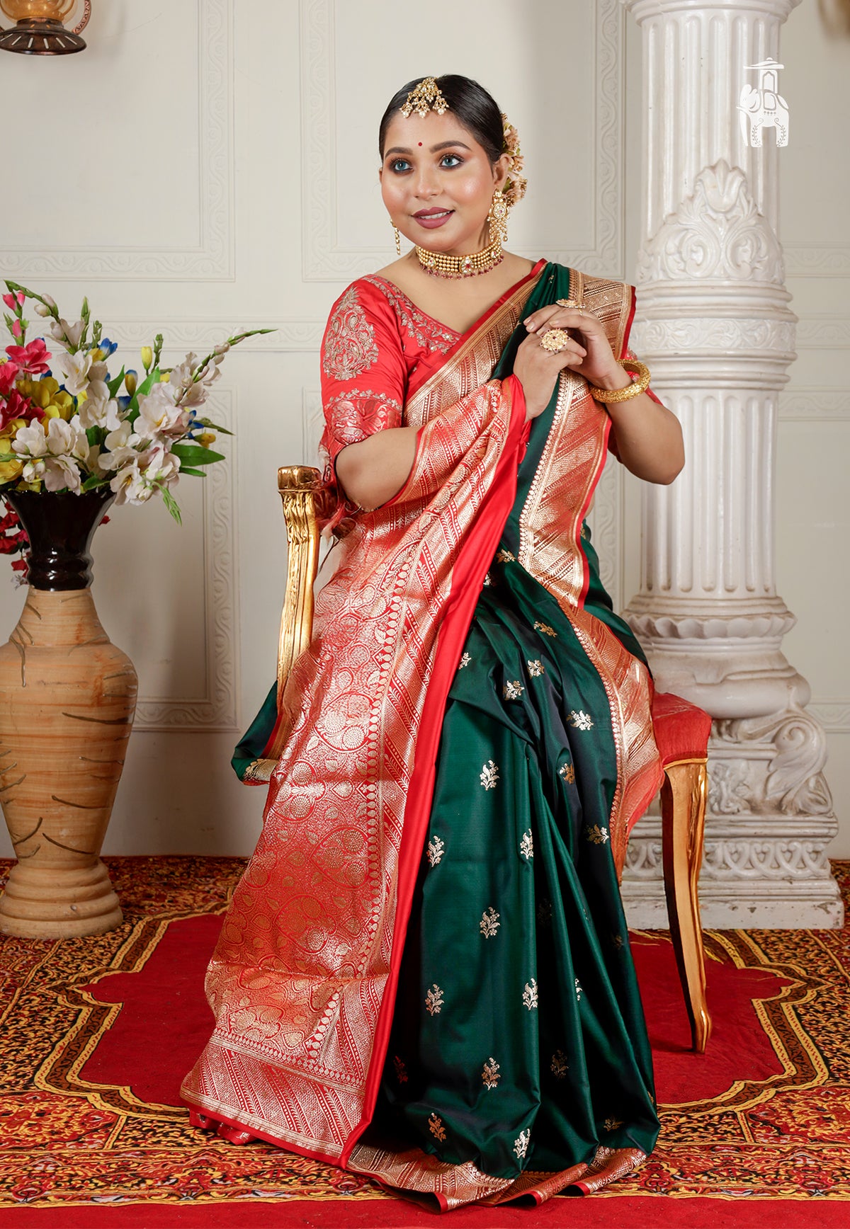 Avail this Green Banarasi Silk Saree for your wedding invitations. Book it now on prepaid payment, to get delivered with FREE SHIPPING.
