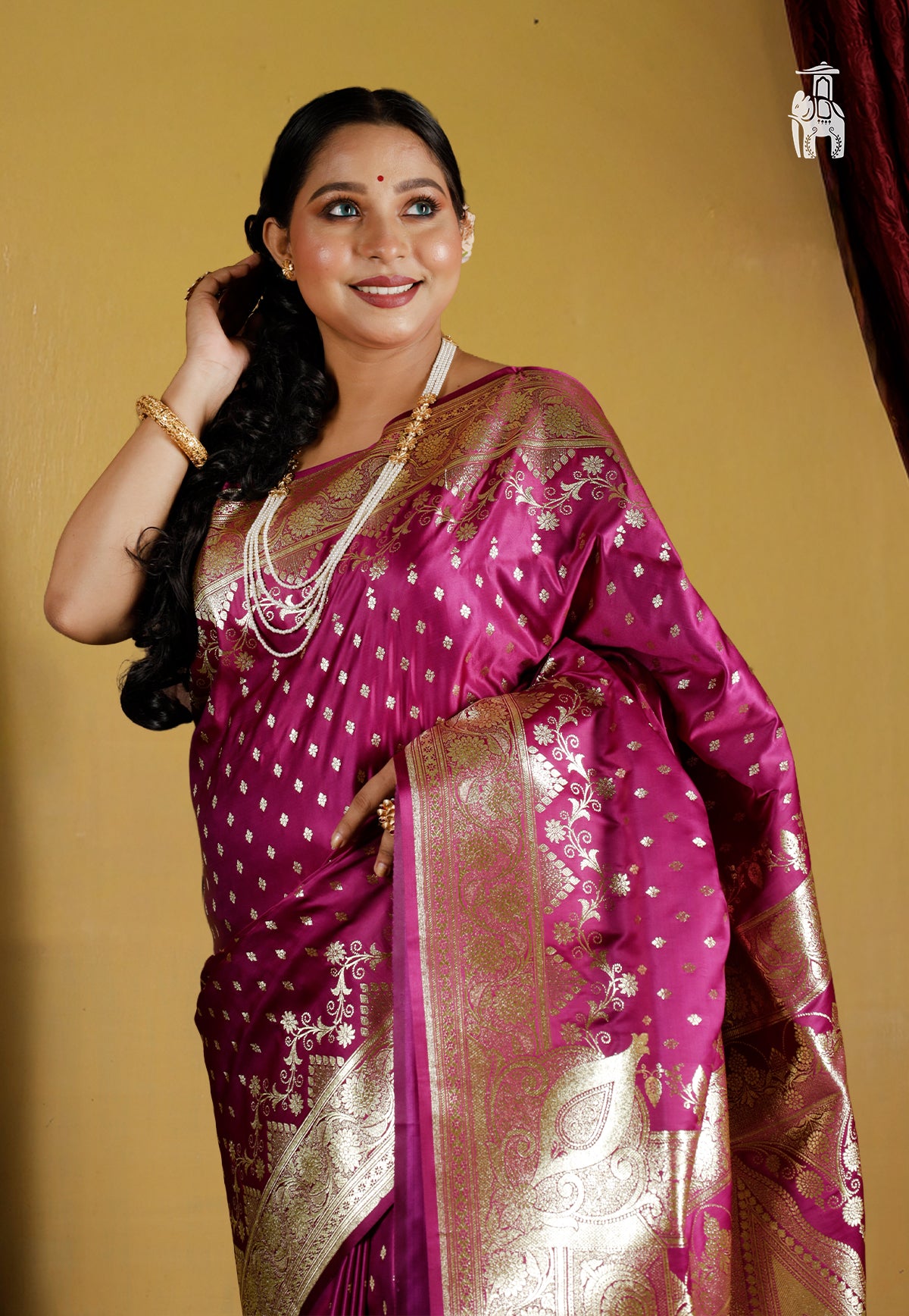 In a Purplish-Pink shade, the saree offers luxurious zari-woven floral patterns, with a rich & lustrous zari-woven border.