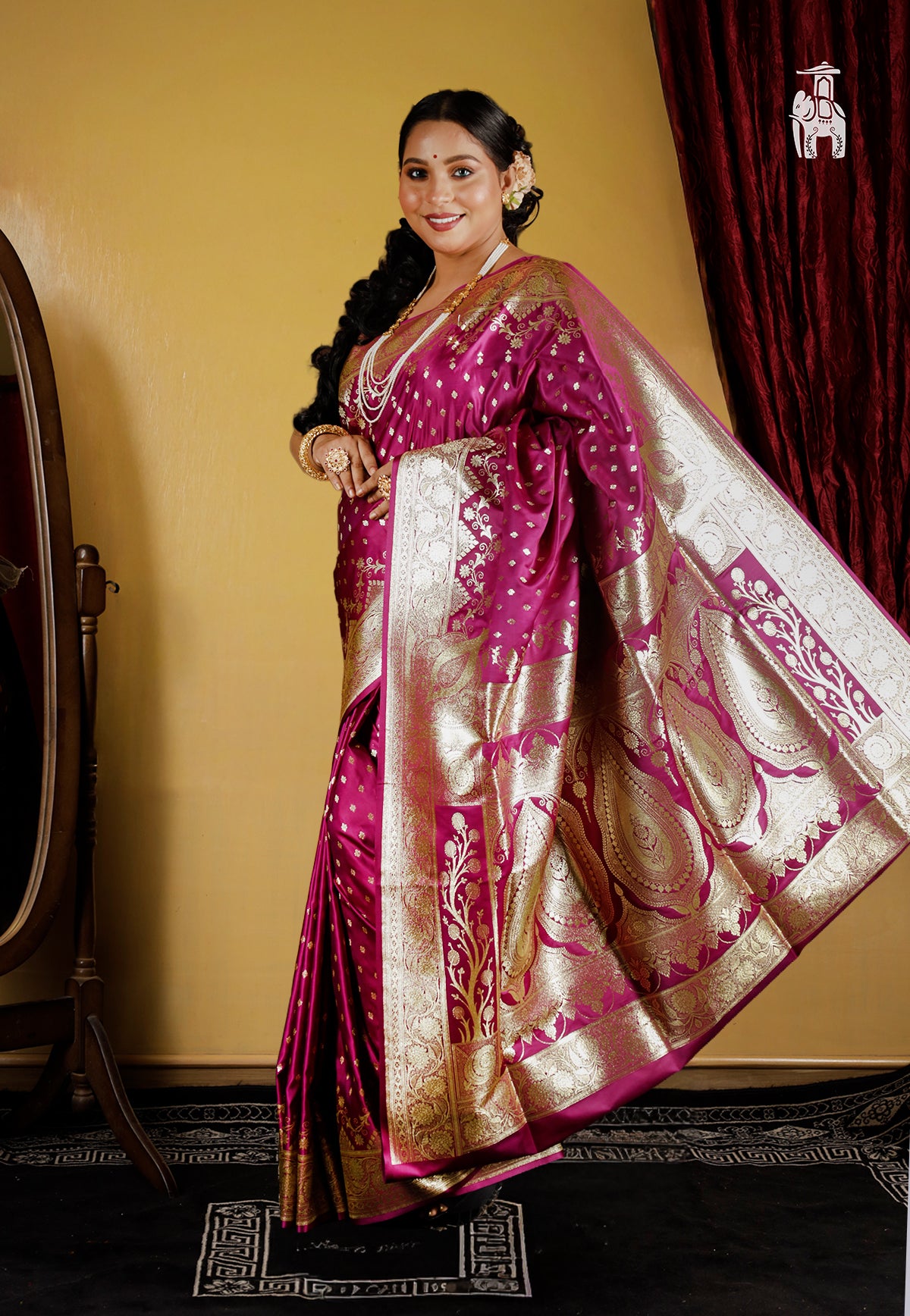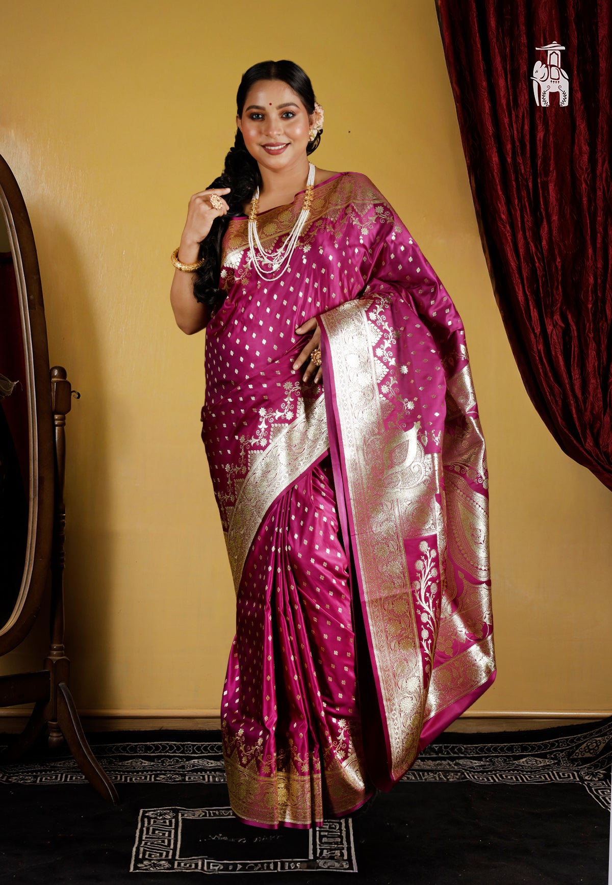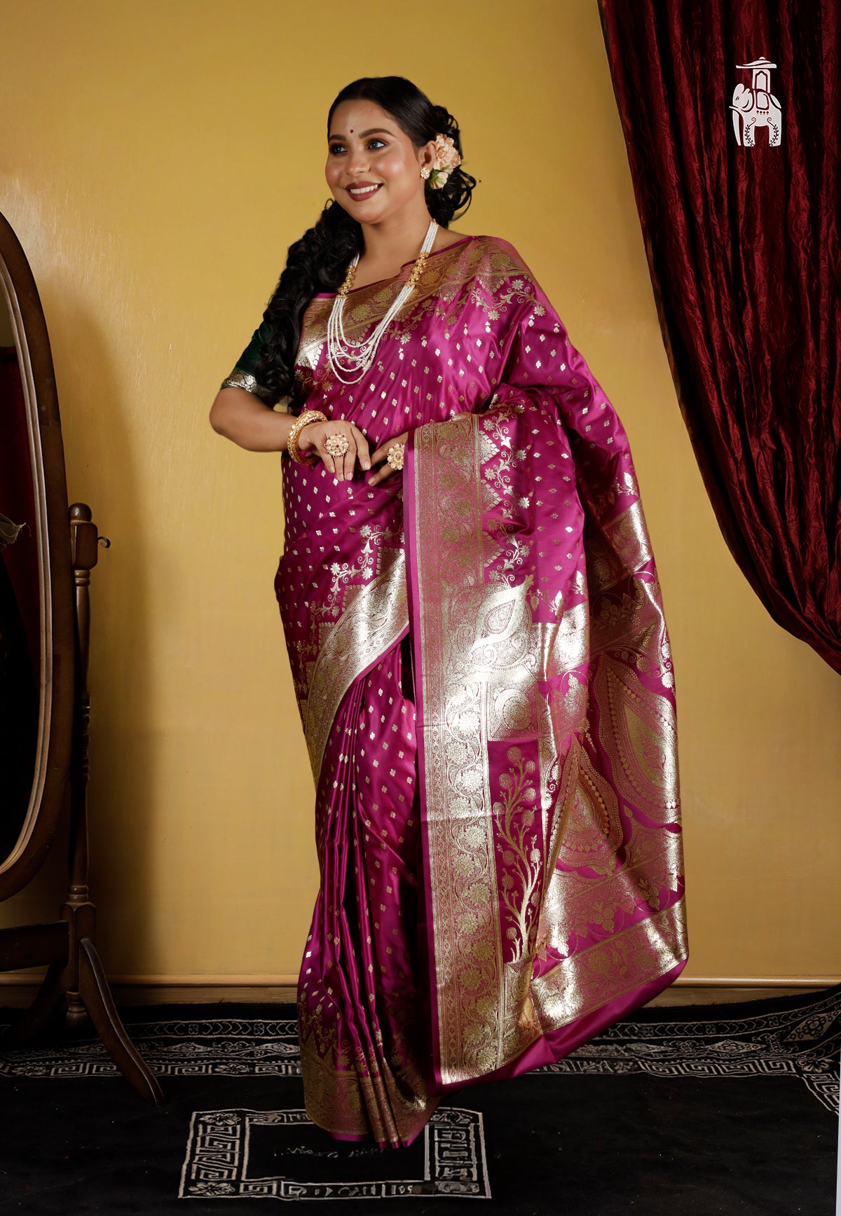 Your most-awaited Pink Satin Katan Banarasi Saree is right here! This royal Banarasi drape flaunts delicately spun Banarasi butis on smooth Satin Katan fabric.