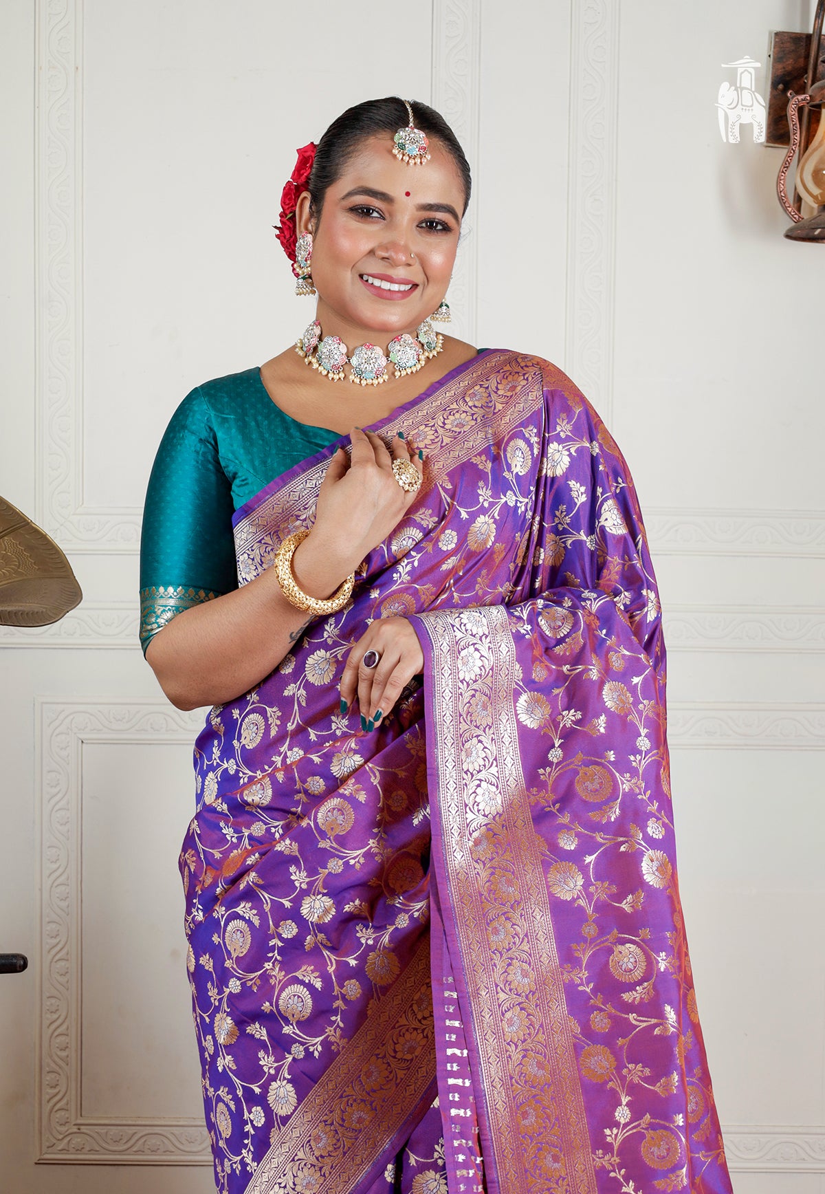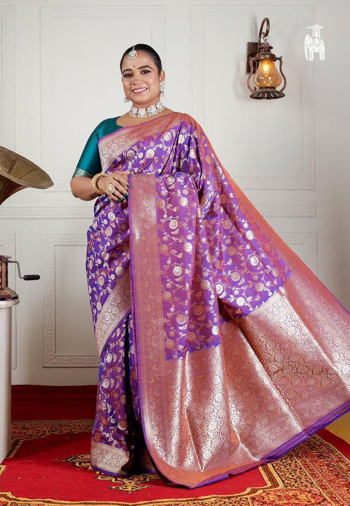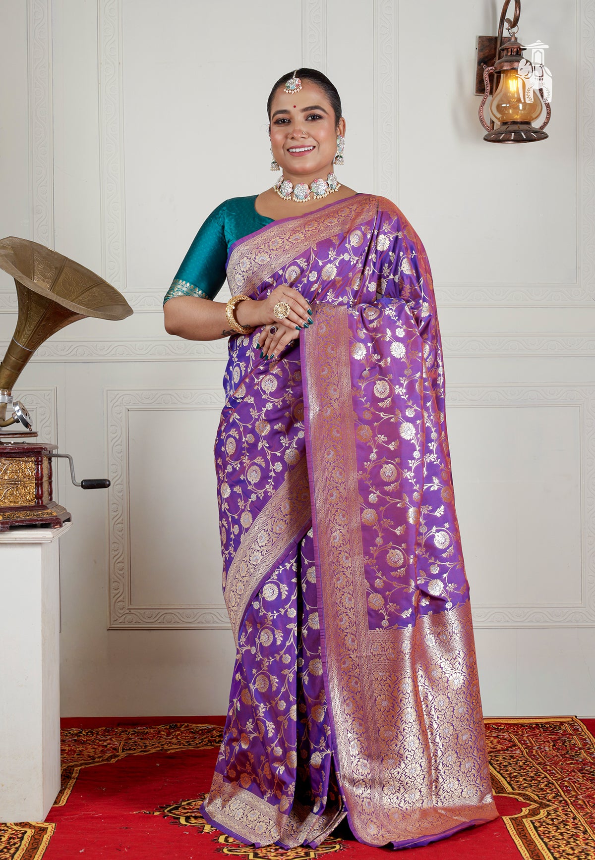 In this wedding season, be the best bridesmaid, wearing this Purple Katan Banarasi Saree with attractive Banarasi designs.