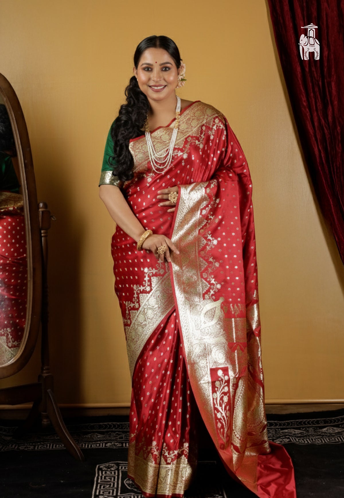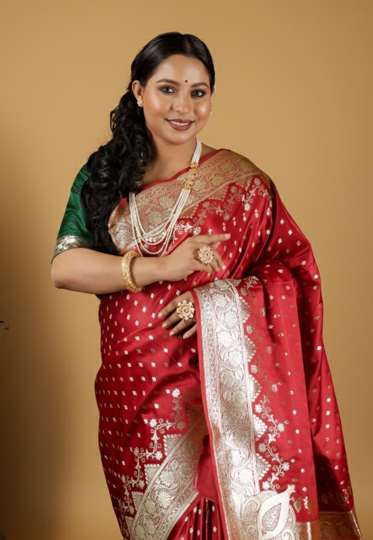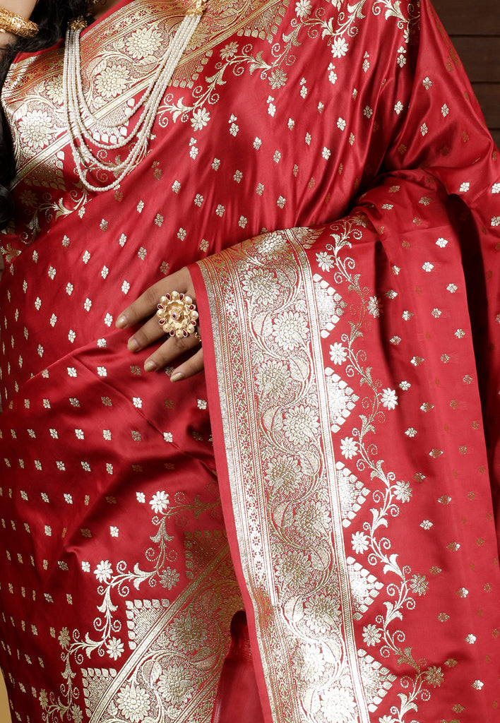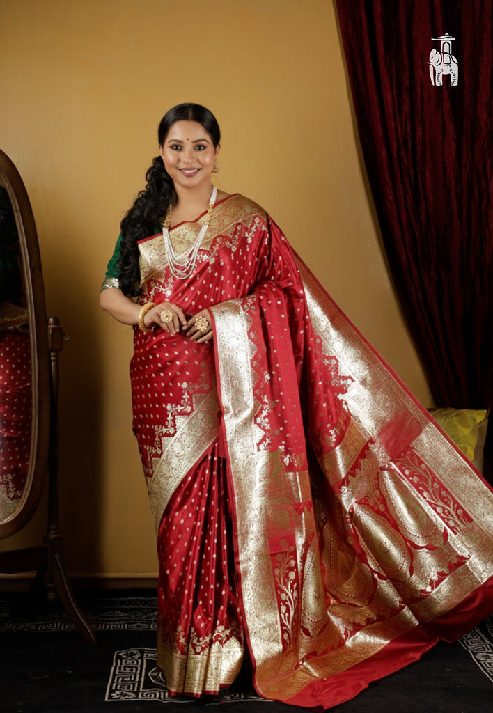 This traditional Banarasi saree drapes you in rich Banarasi butis, well-woven on luxurious Katan Silk fabric, in a passionate Red shade.