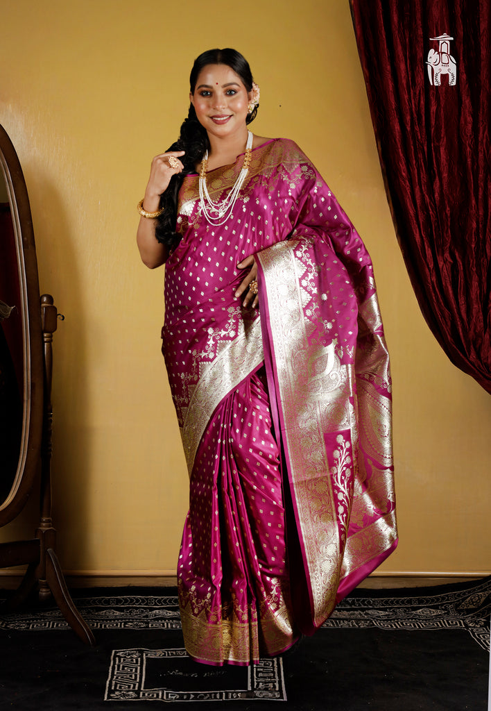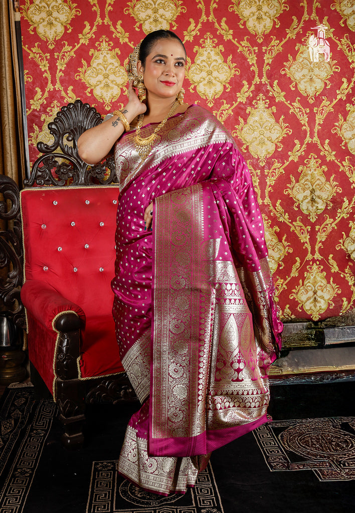 Chunri buti, or mini zari motifs, is in trend for Banarasi sarees. See this Purple Pure Silk Katan Banarasi Saree with Chunri Buti, a luxurious Katan Banarasi saree for newly wedded brides at a price of ₹43,000.