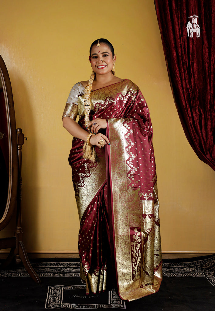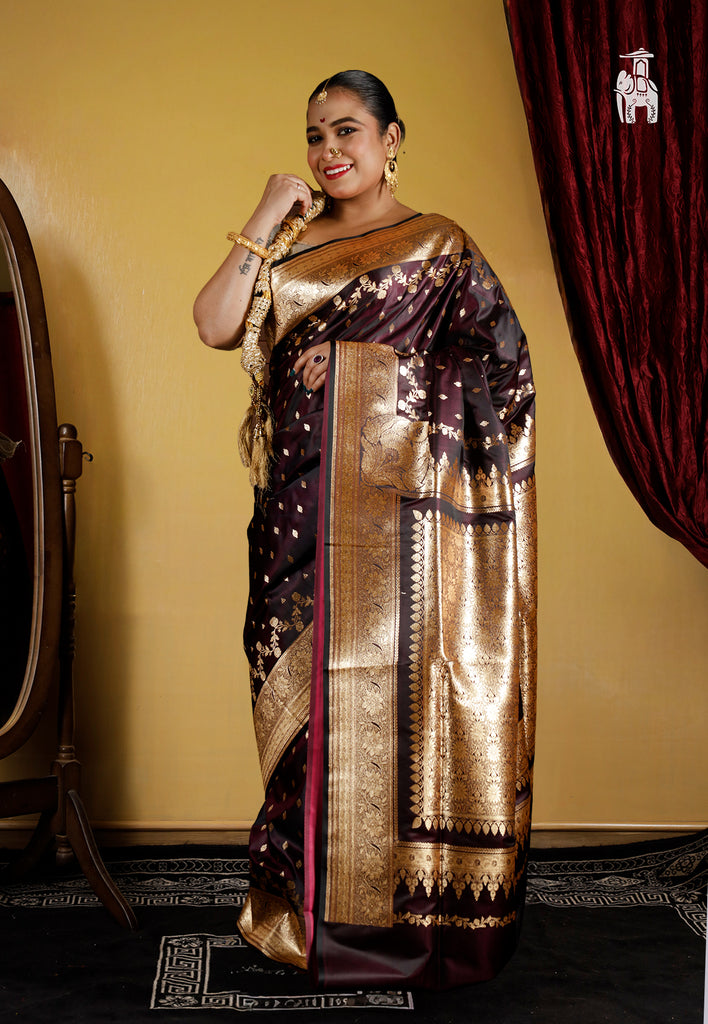 Floral butidar jaal work is the most popularly demanded zari work for bridal Banarasi sarees at Legacy of Bhojraj. If you, too, admire heavy, 100% Pure Banarasi sarees with Floral jaal butis, check this out - Wine Pure Silk Katan Banarasi with Jaal Work