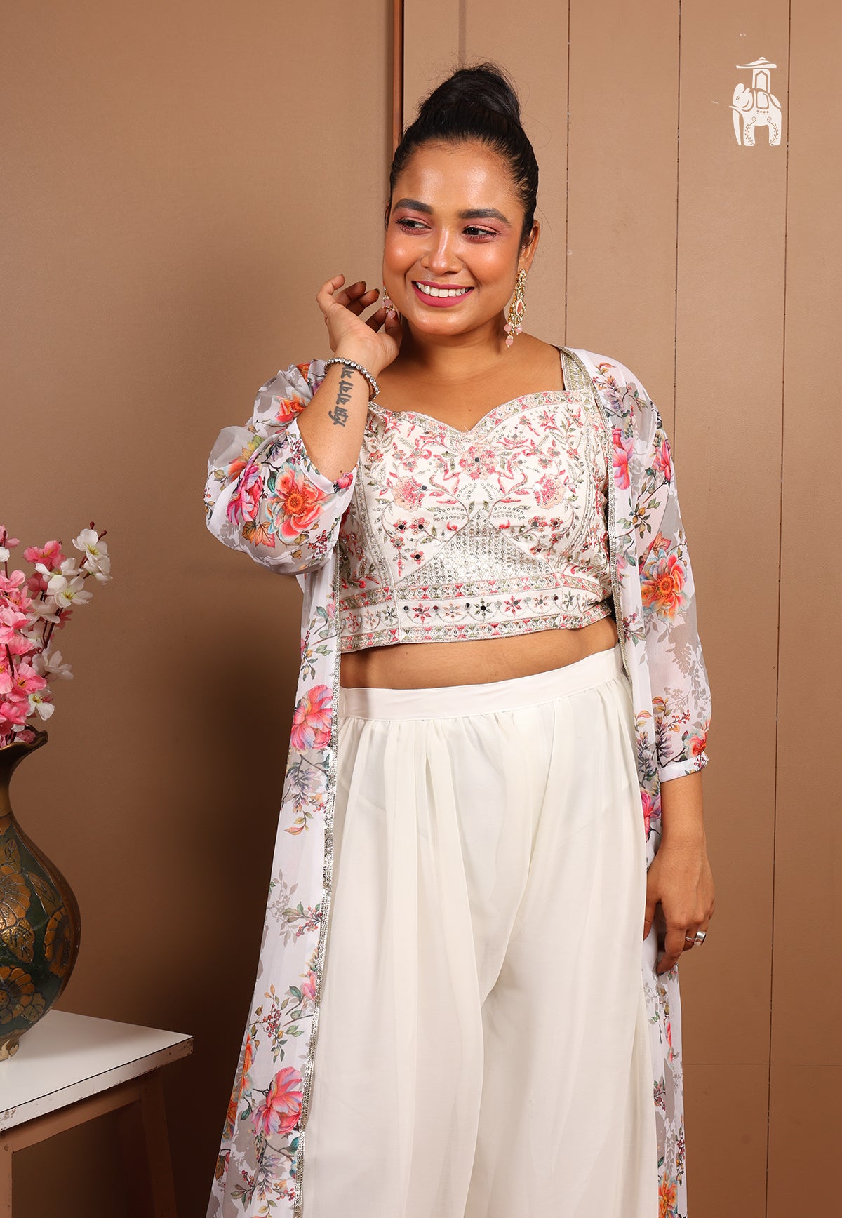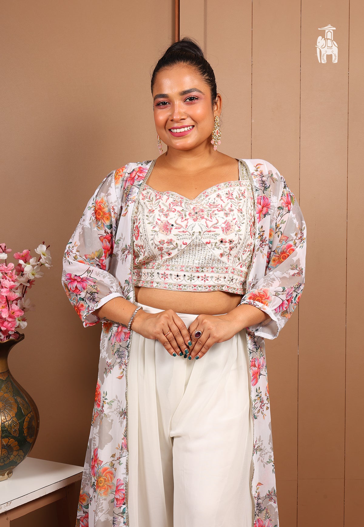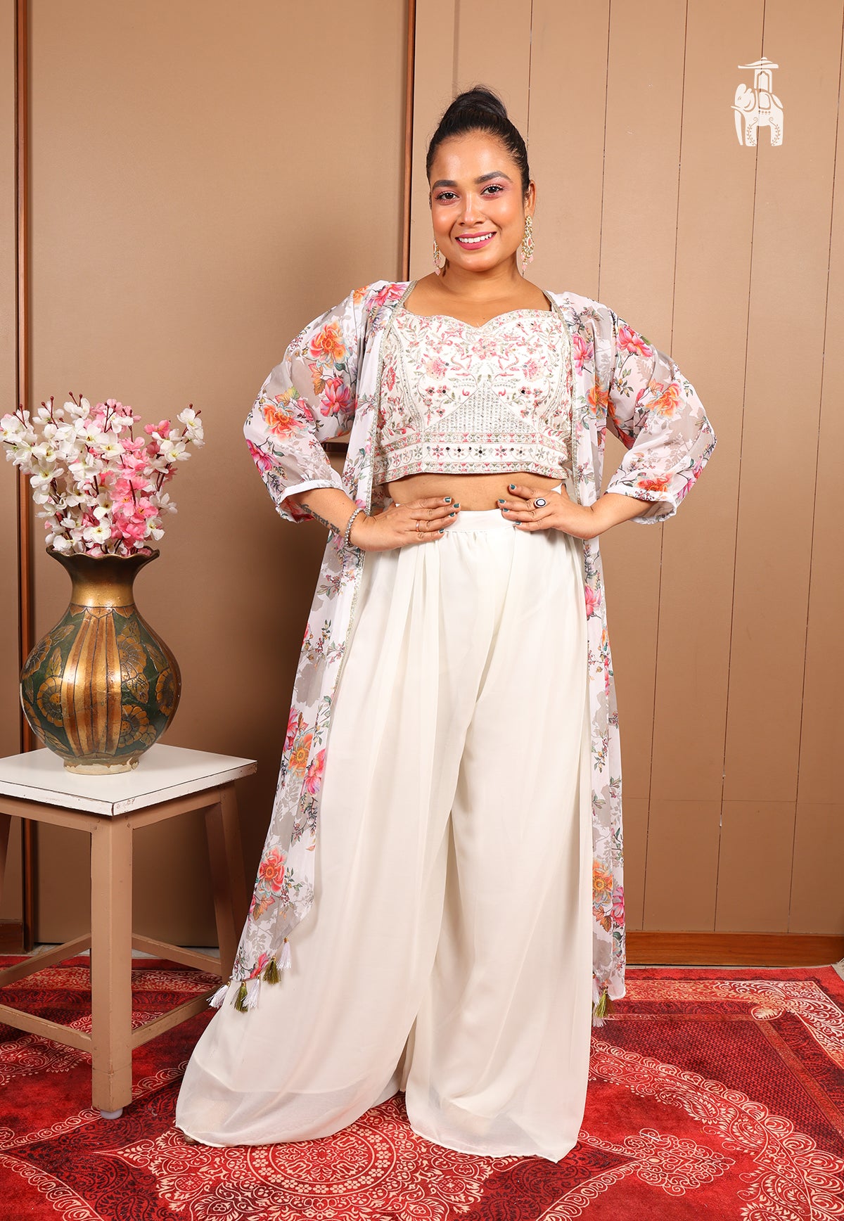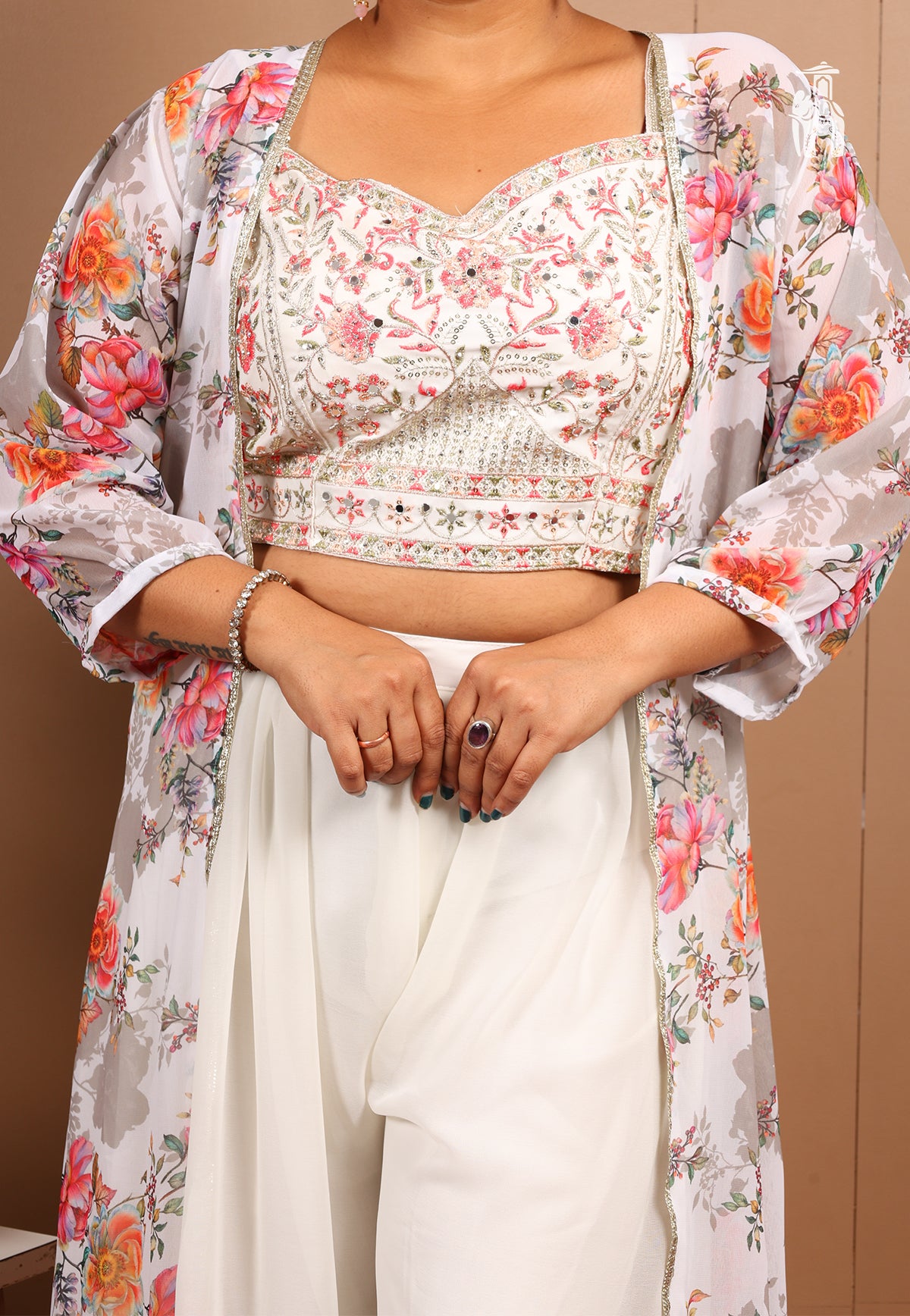This Co-ord set brings a crop top, featuring intricate detailing, on its shimmery top, a plain pant, styled with a floral printed shrug.