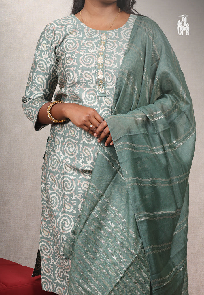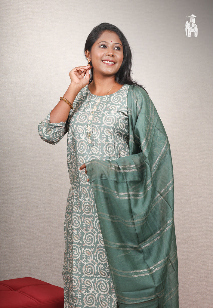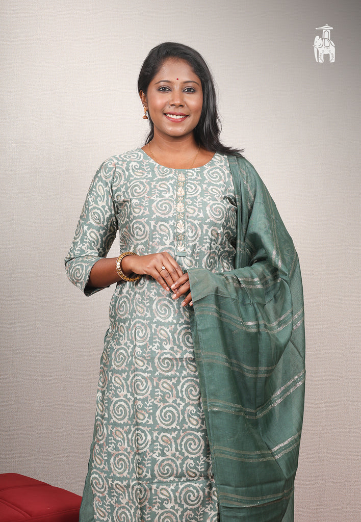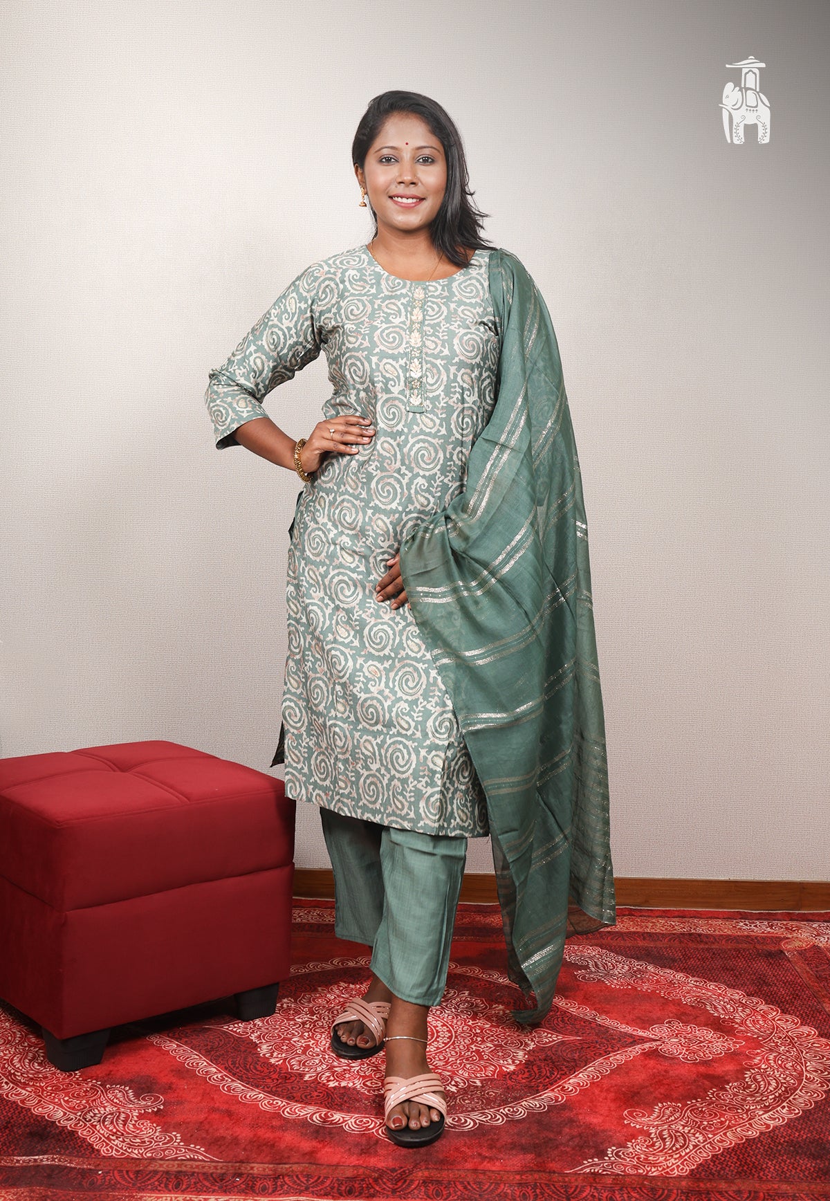 Shop this traditional Green Suit Set with batik-style prints, with a Rayon-weft pant, so that you can carry yourself in elegance.