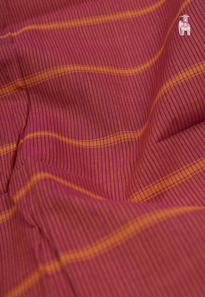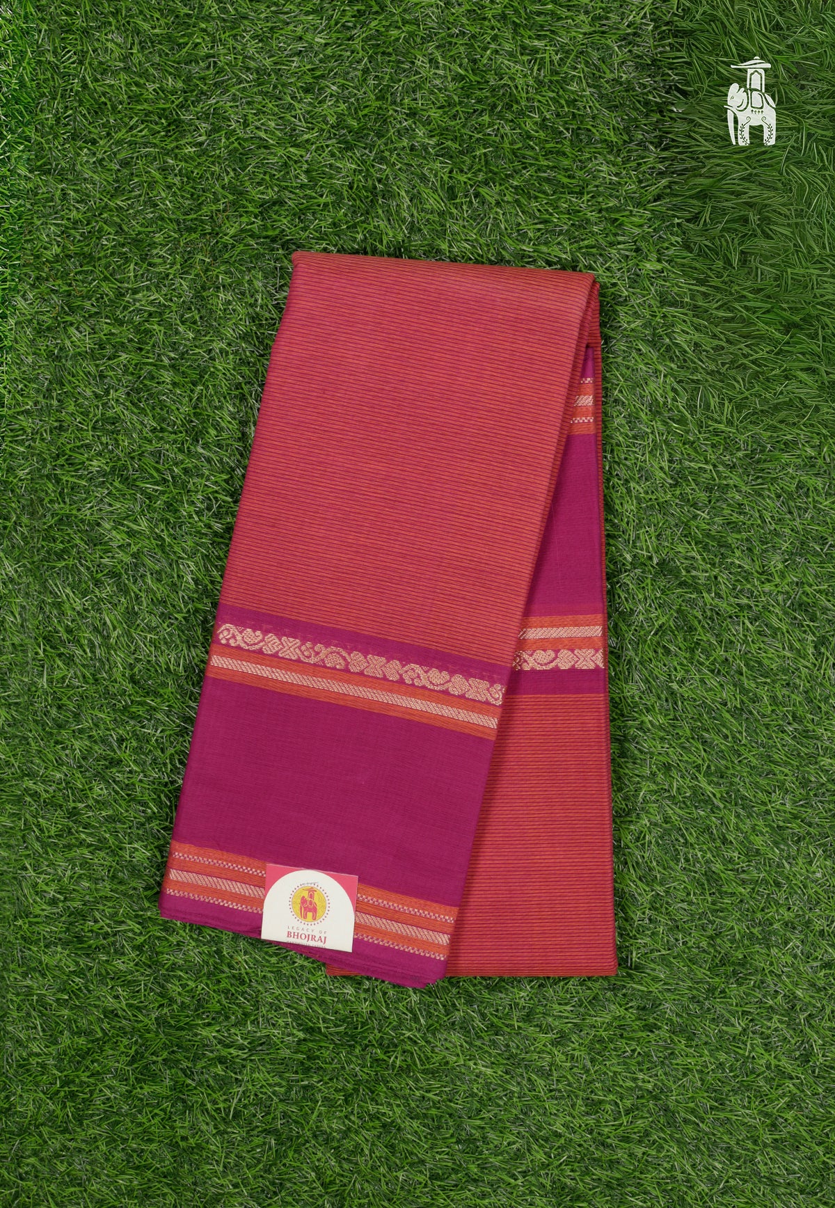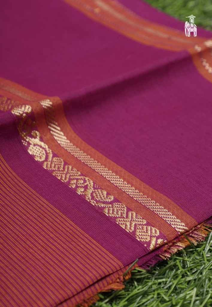 It's a plain, Maheshwari cotton saree woven of 100% authentic cotton, bordered with Resham zari, outlined with a Purple border.