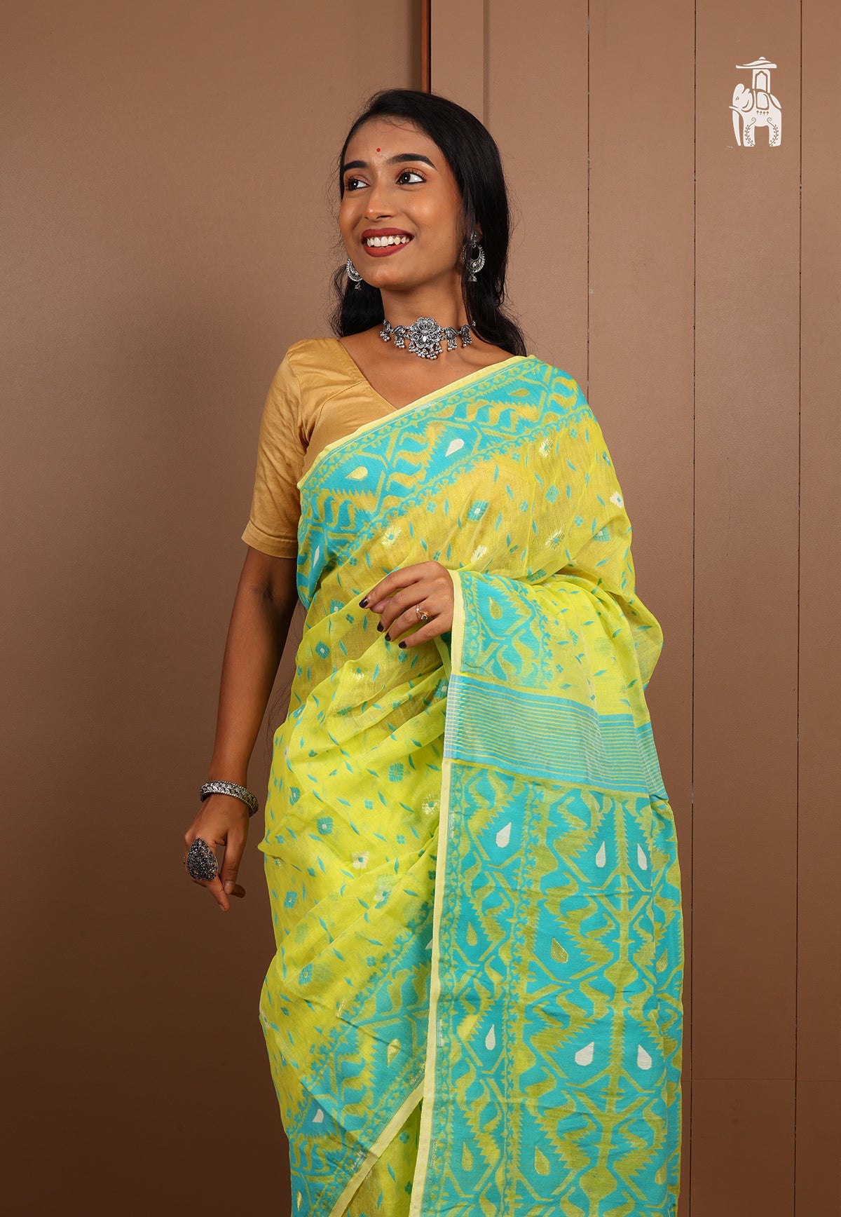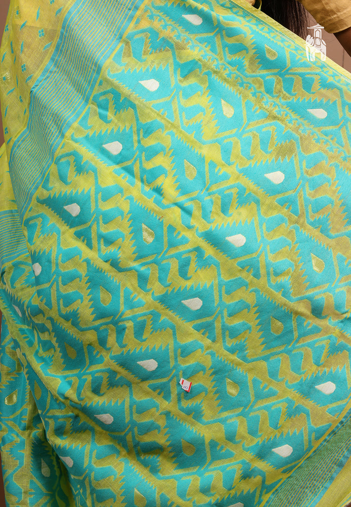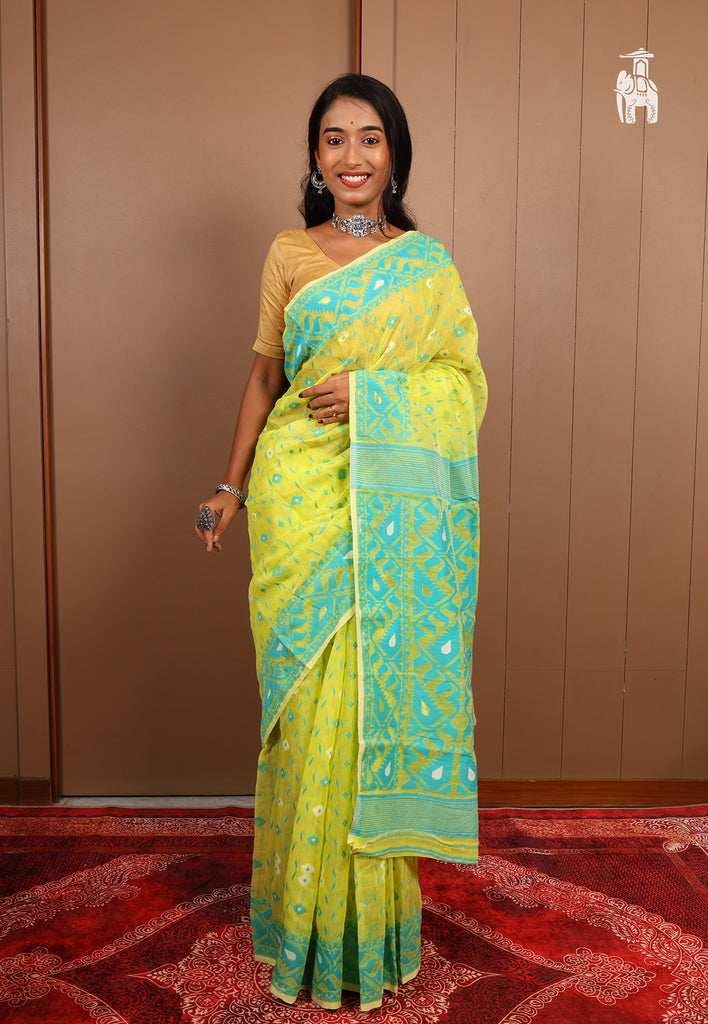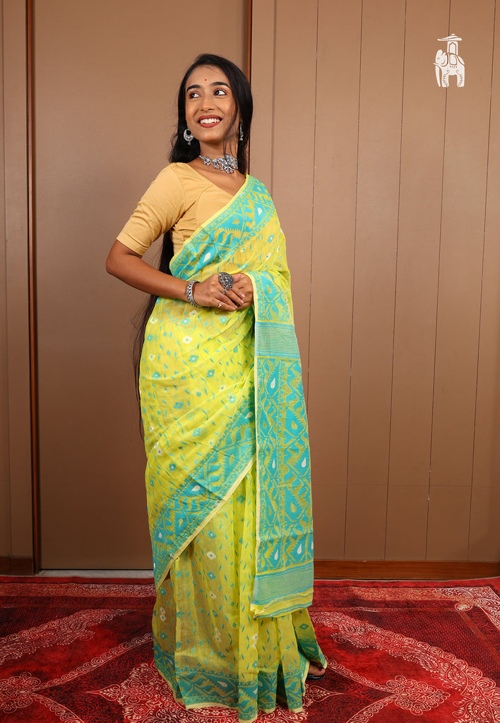 Glow in this newly arrived festive attire, a Yellow Dhakai Jamdani Saree with Blue Jamdani border.