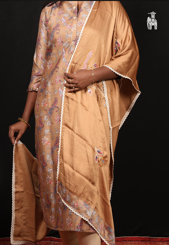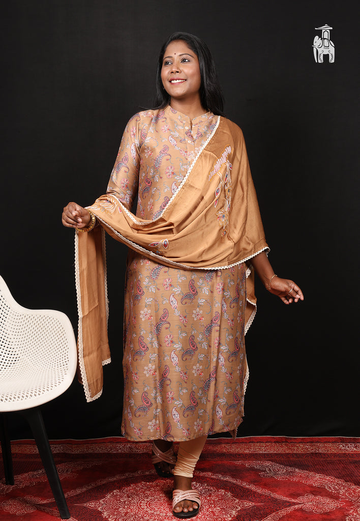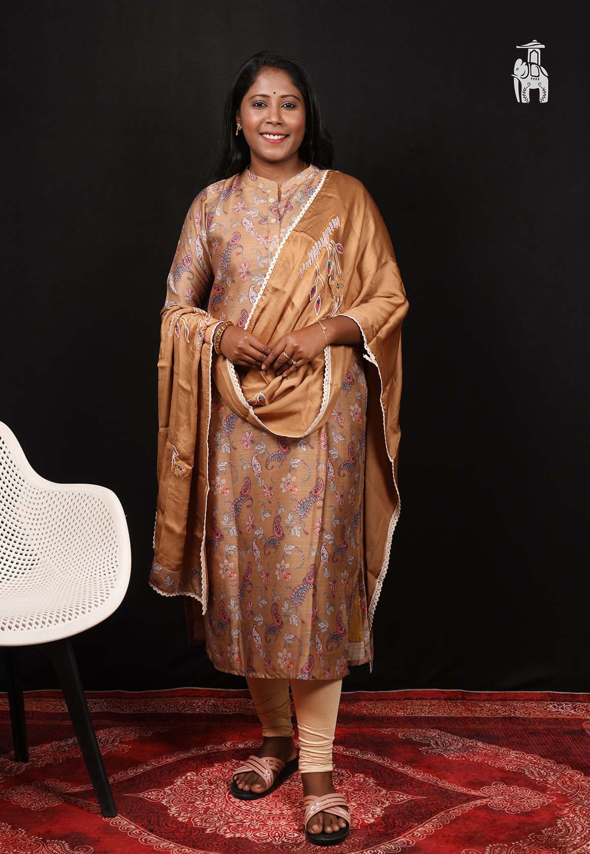 Bringing to you, this special Brown Suit Set offers you a lustrous high-neck straight fit kurta with traditional prints and an elastic bottomwear.