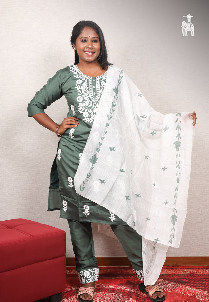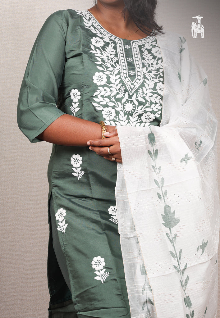 Check out this special Green Suit Set with all over threadwork floral embroidery details on soft, body hugging fabric.