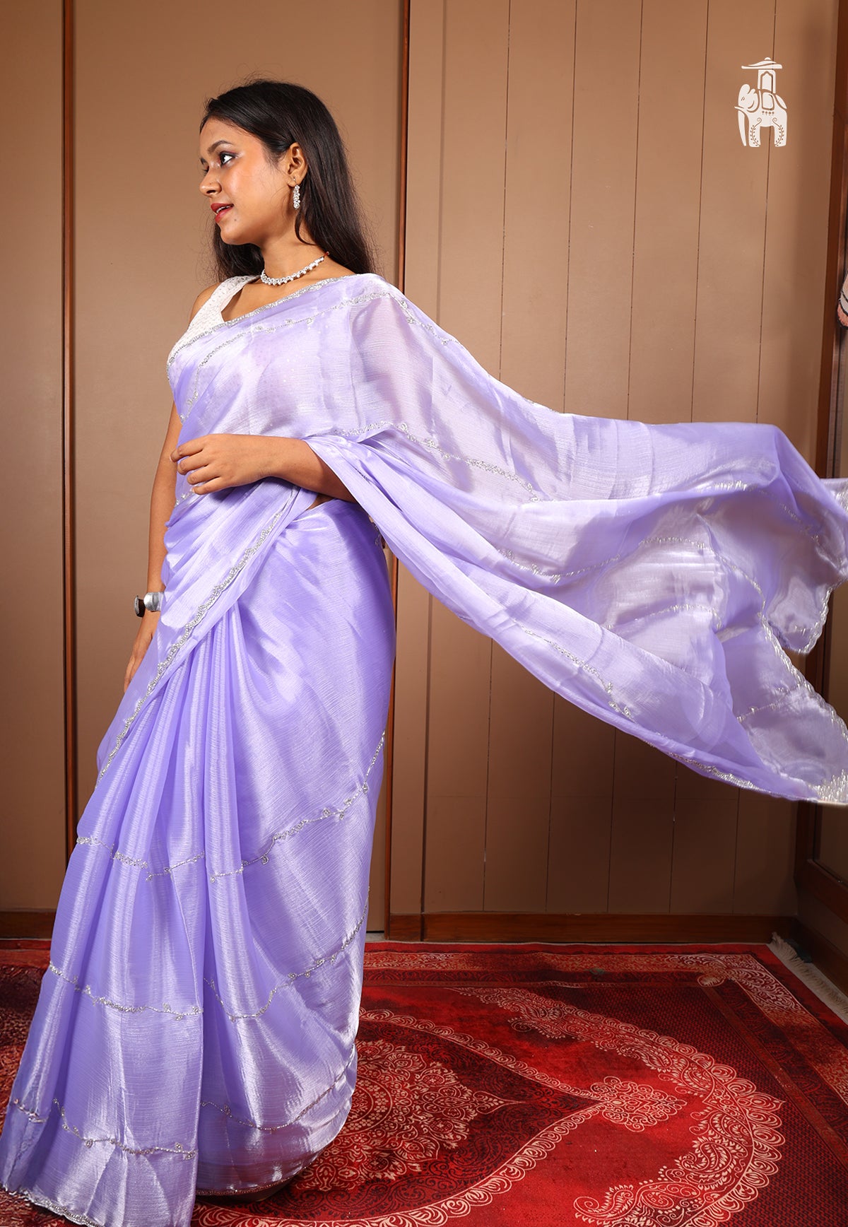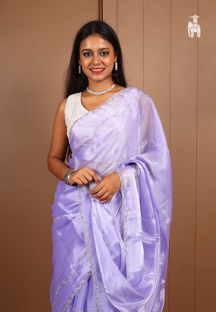 Celebrate your Diwali in this naturally lustrous Lavender Jimmy Choo Saree with all-over shimmery details.