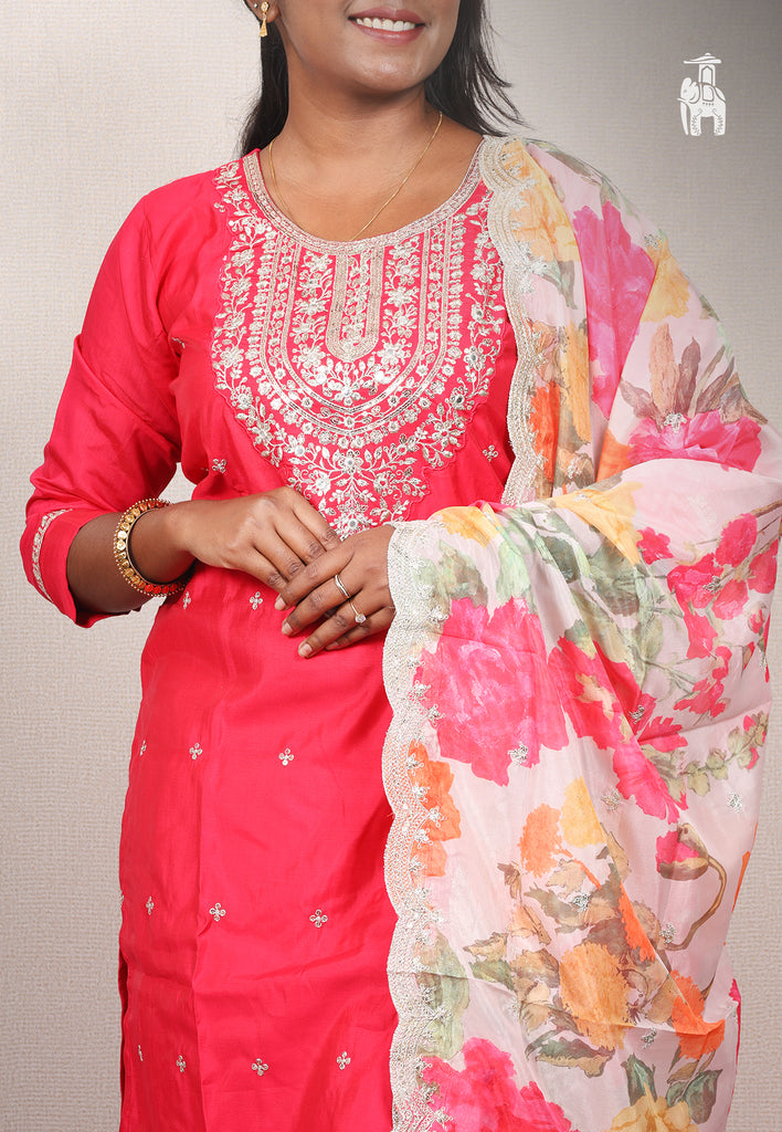 In a Reddish Pink shade, you get a 3-piece suit, which includes a straight fit Kurta, a matching pant, with a dupatta in embroidered border & floral dyed designs.