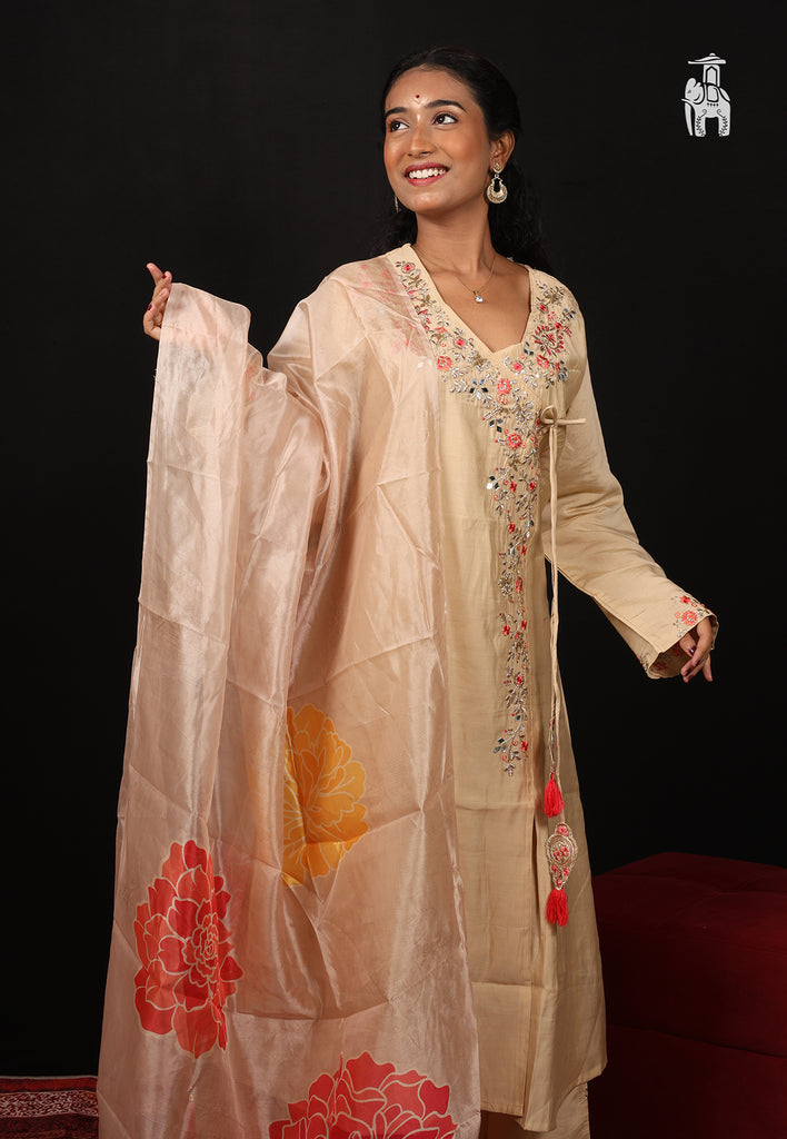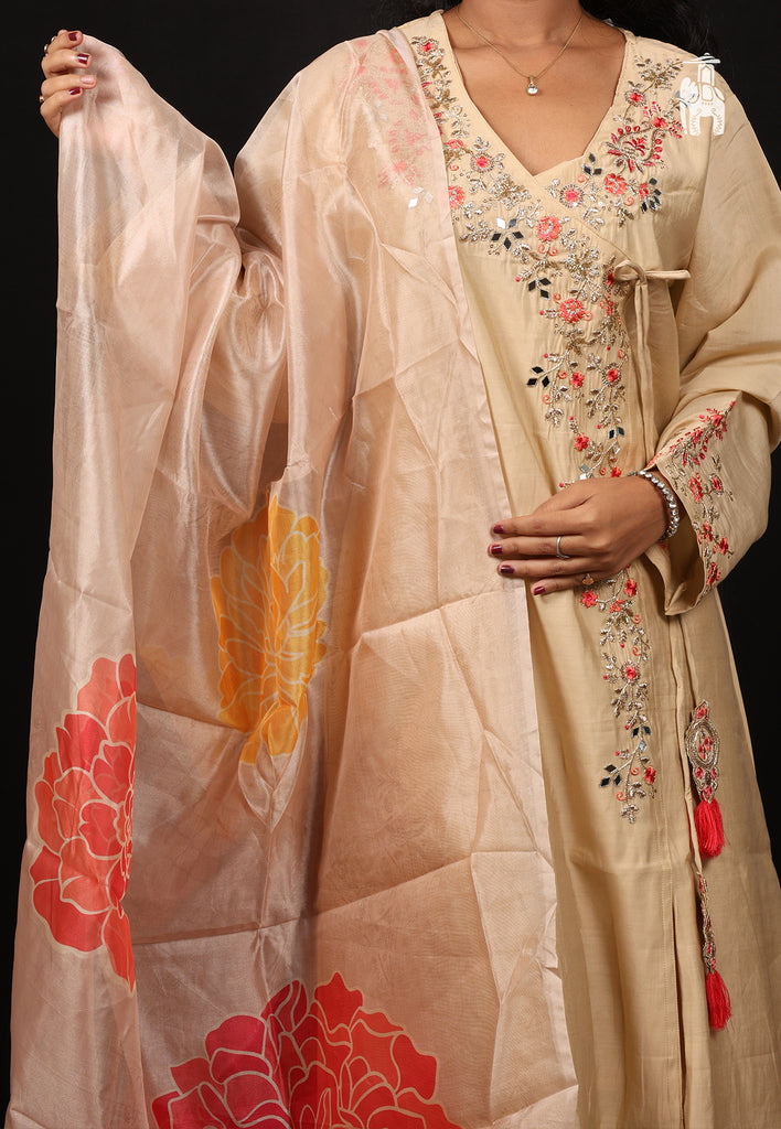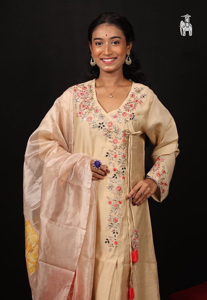 For your reception party, wear this Angrakha style Soft Beige Suit Set, with intricate detailings, & floral patterns.