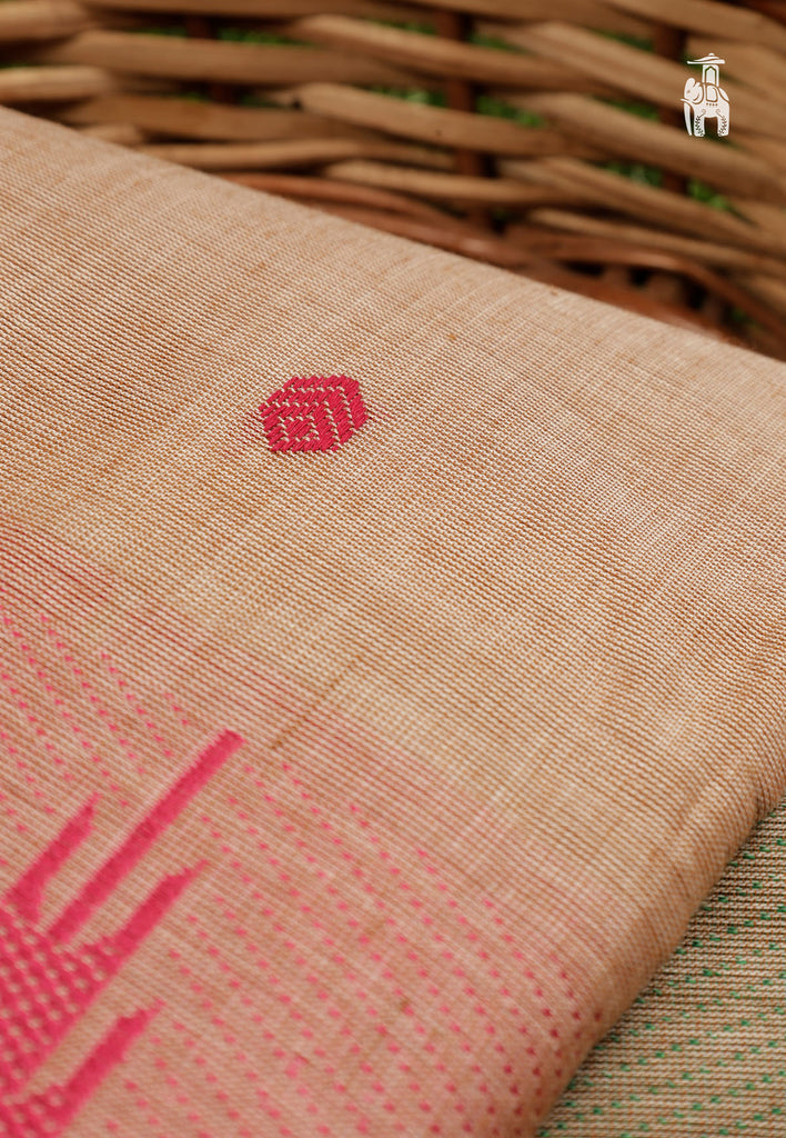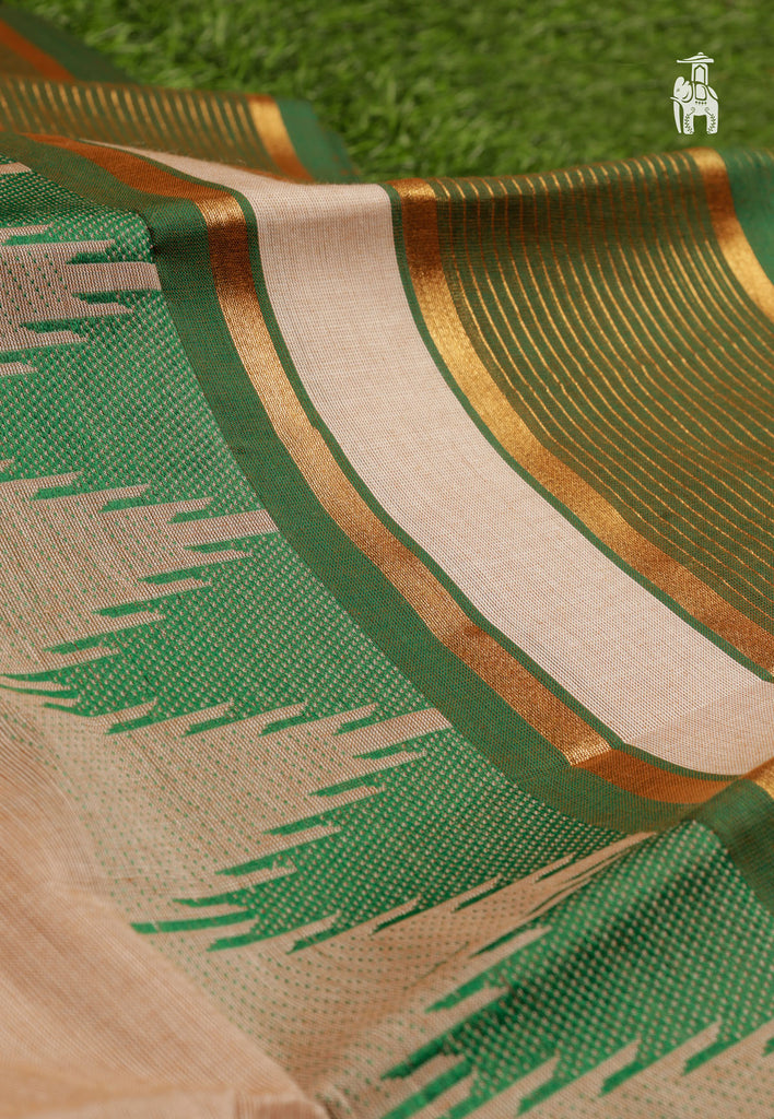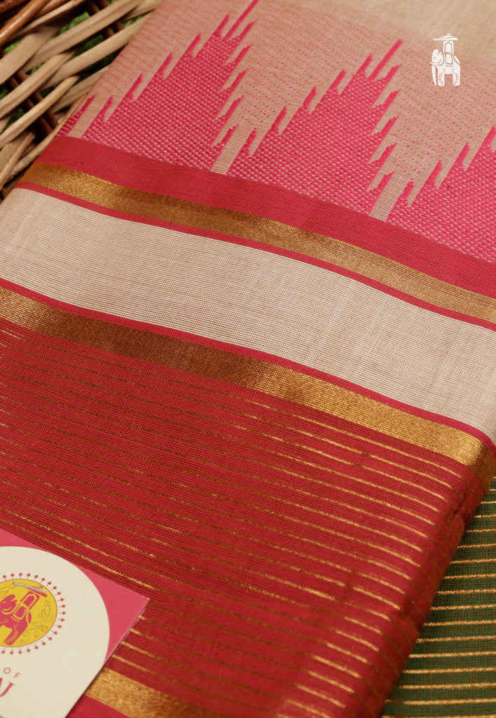 Get ready for your auspicious occasions wearing this traditional Cotton Kanjivaram saree with intricate kanchi temple motifs & mini floral designs.