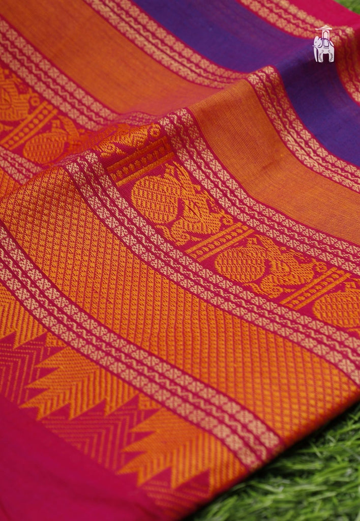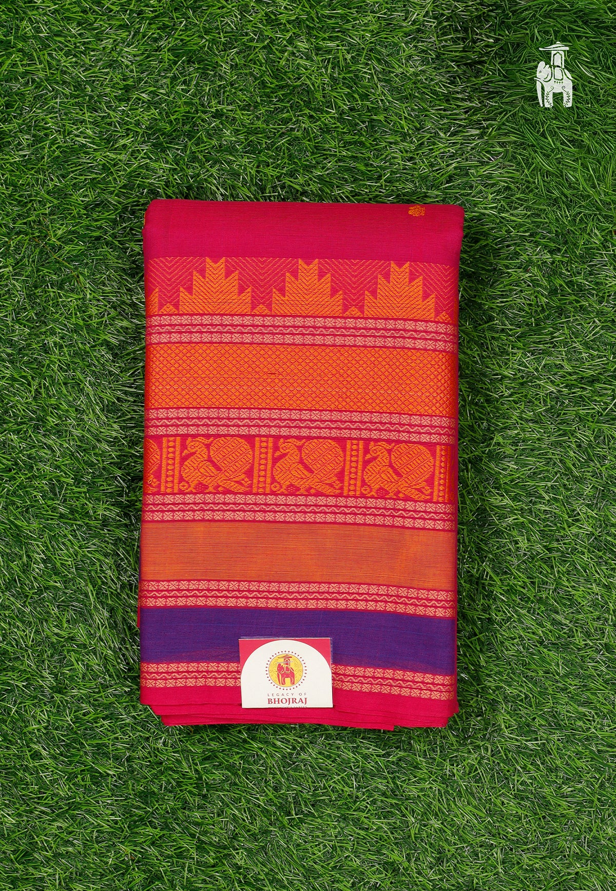 Invited to a festival gathering? Drape into the vibe of this Pink Kanchi Cotton Saree with peacock and Temple border.