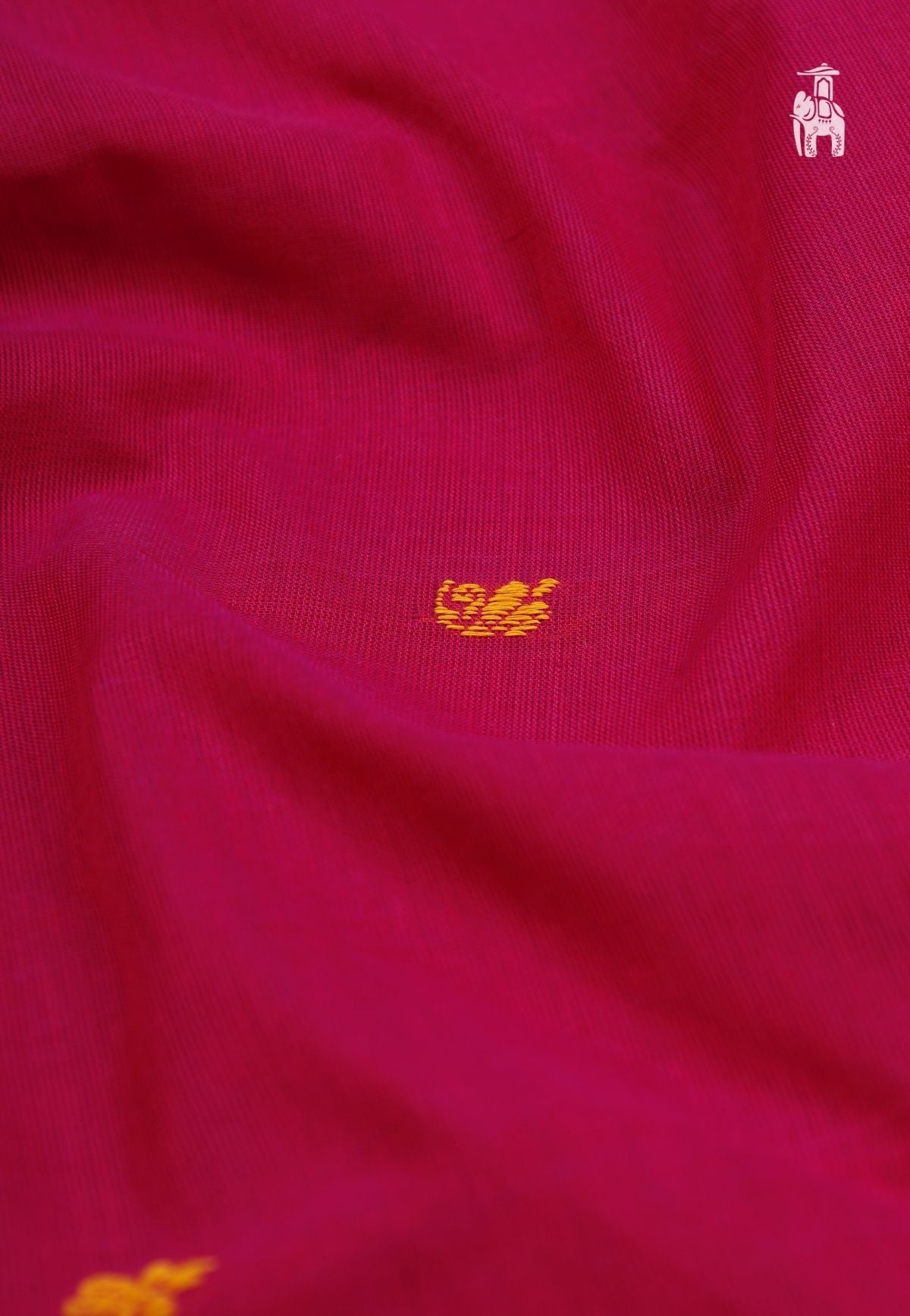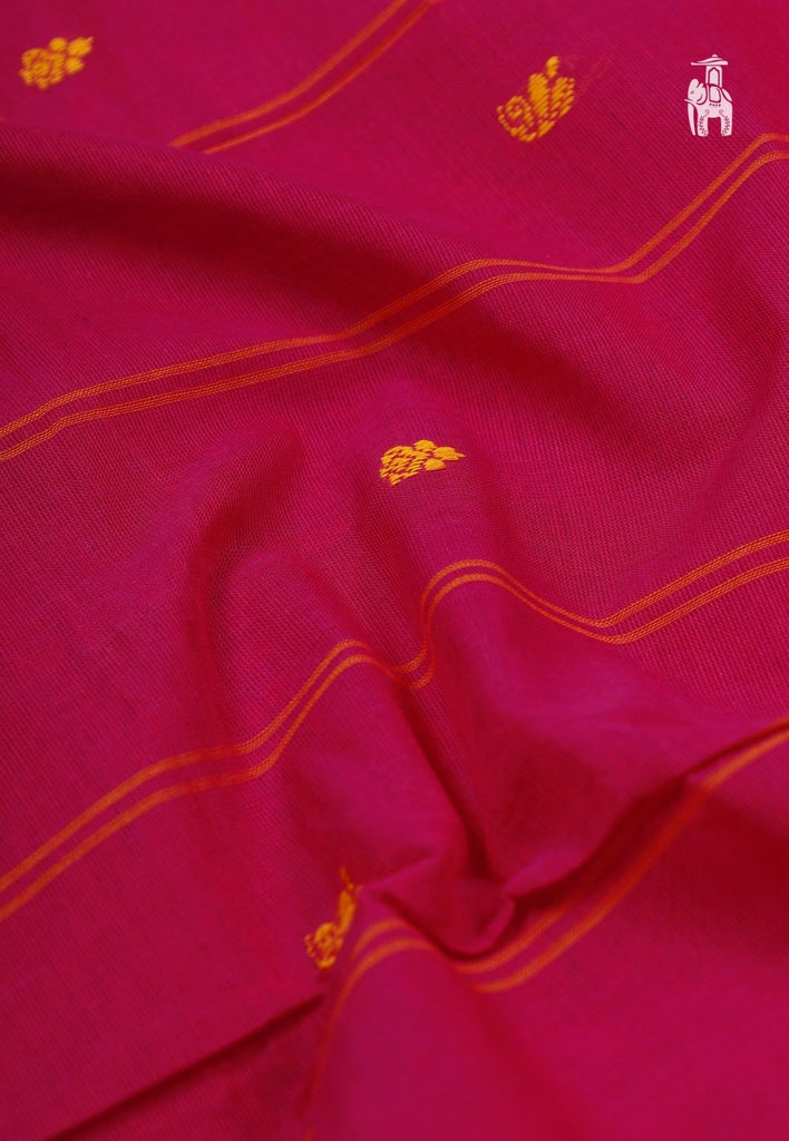 In a Bright Pink, Pure Cotton woven body, the saree reflects small Resham woven buttas for an authentic, ethnic appearance for any cultural event.