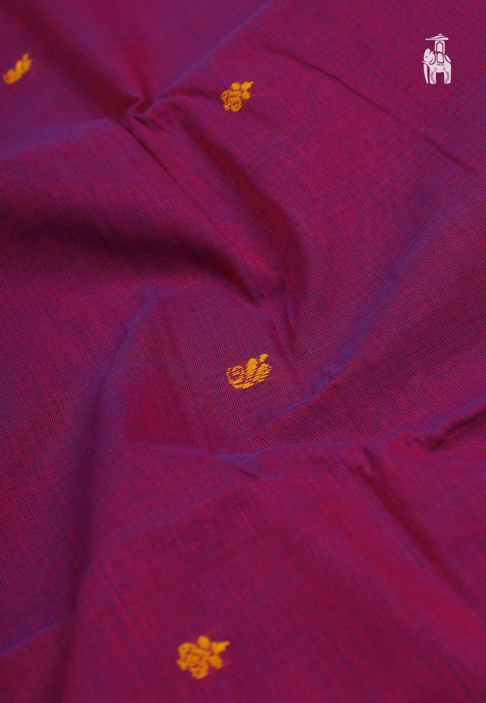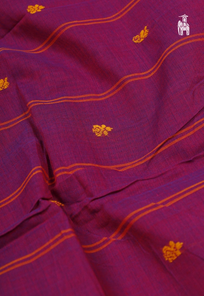 In a rich shade of Purple, this saree comes with Resham buttas, intricately spun on Pure Cotton fabric to blend comfort & style in the same outfit.