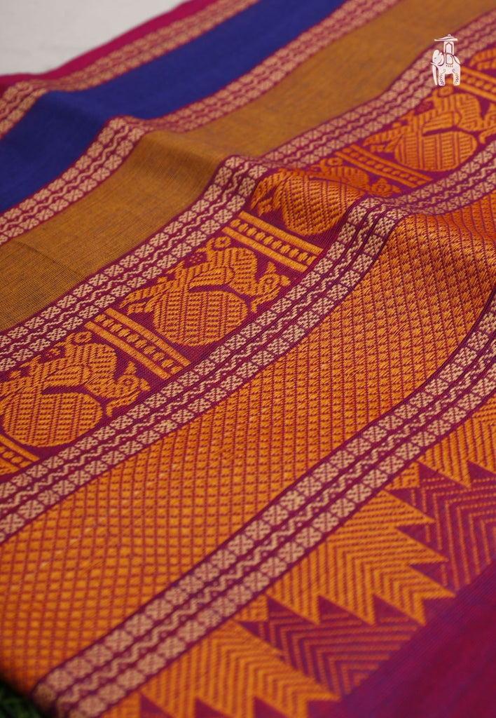 Get this traditional attire, a Purple Kanchi Cotton Saree with authentic Resham zari woven Peacock & temple border.