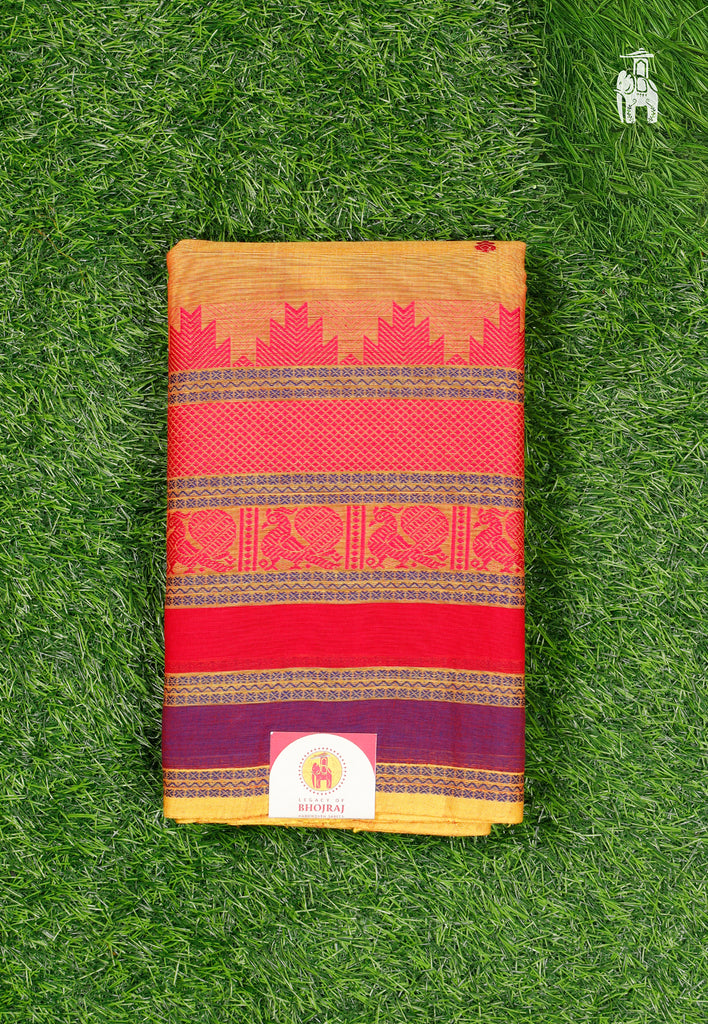 Make your big moment even special in this Yellowish Orange Cotton Kanjivaram Saree with a shiny Red border, to make every moment of your celebrations worth it!