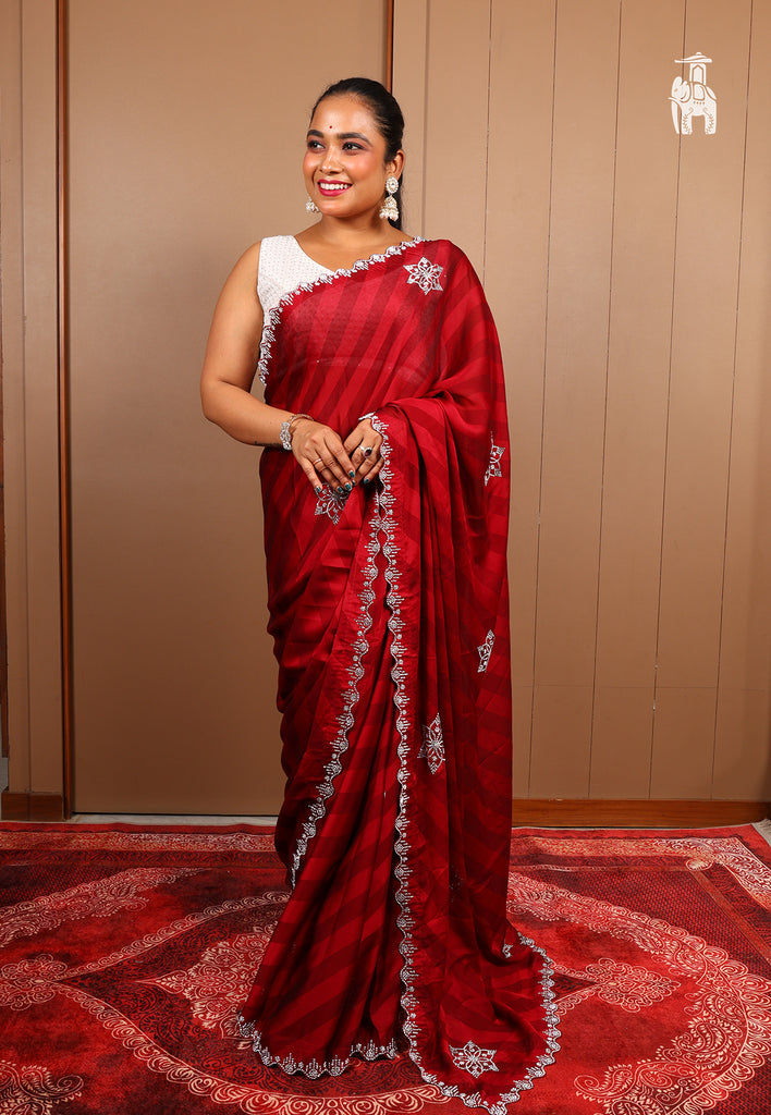 For all designer saree lovers, our collection offers this Maroon Designer Ghicha Tussar Saree with Piping Frill Border at just ₹12138 only. It’s a handwoven Tussar Silk Saree with ‘Ras leela’ hand-painted designs, crafted specially for auspicious occasions.