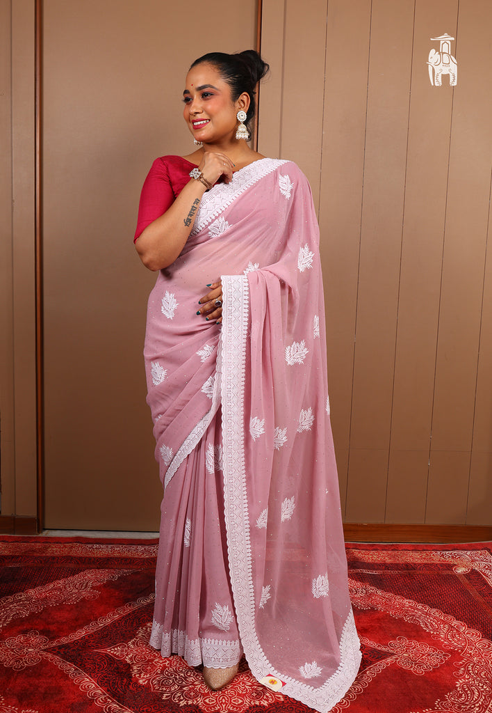 Be the gorgeous bride wearing this, Pink Khaddi Georgette Saree with all-over butta work on a lustrous Silk Saree for your Karwa Chauth festival. You get a running blouse piece with the saree for free customization of your Karwa Chauth look. Buy at ₹3060 only.