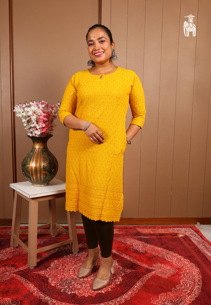 Visiting your bestie or going on a new trip? Dress yourself as a presentable & fashionable lady wearing this Mustard Yellow Khadi Cotton Kurti.