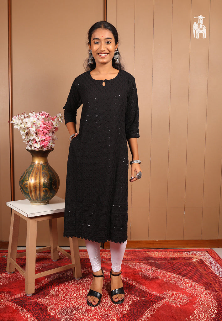 Invited to an Auspicious gathering at your home? This smooth Black Lotus Printed Kurti will make you stand out in its gorgeous Lotus prints & classic Black shade. With minimal sitara details, this kurti can be a fantastic casual wear too! Style at evening hangouts, or grab compliments on meet-ups, this kurti is a dreamy solution. Order now!