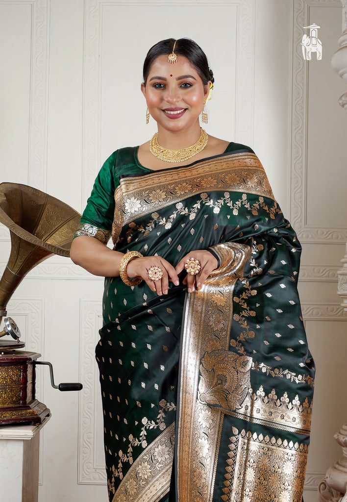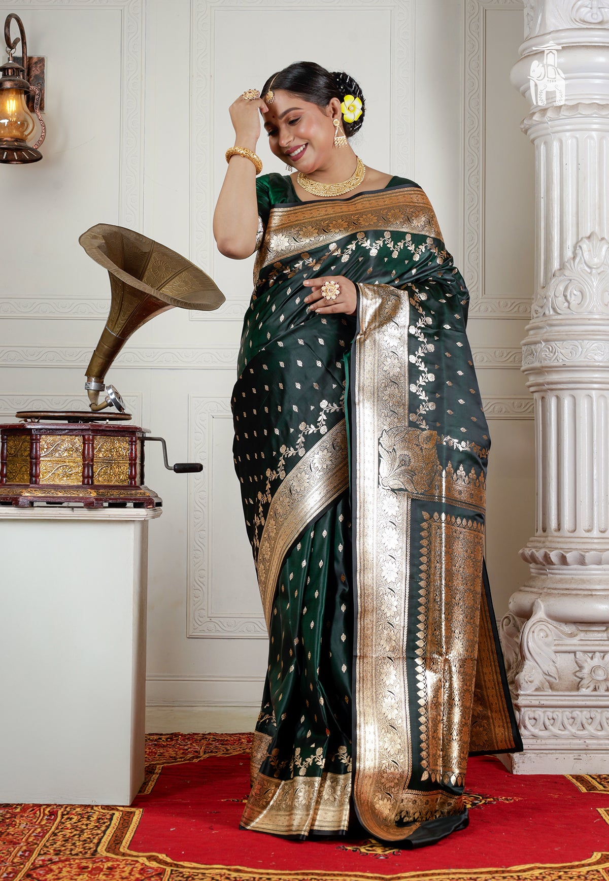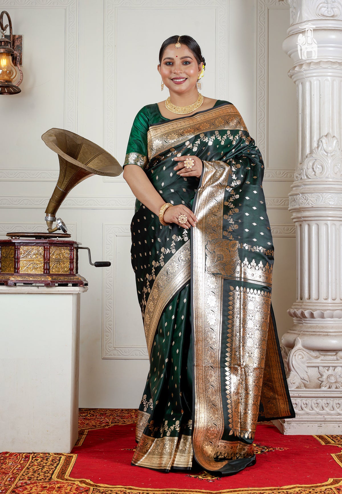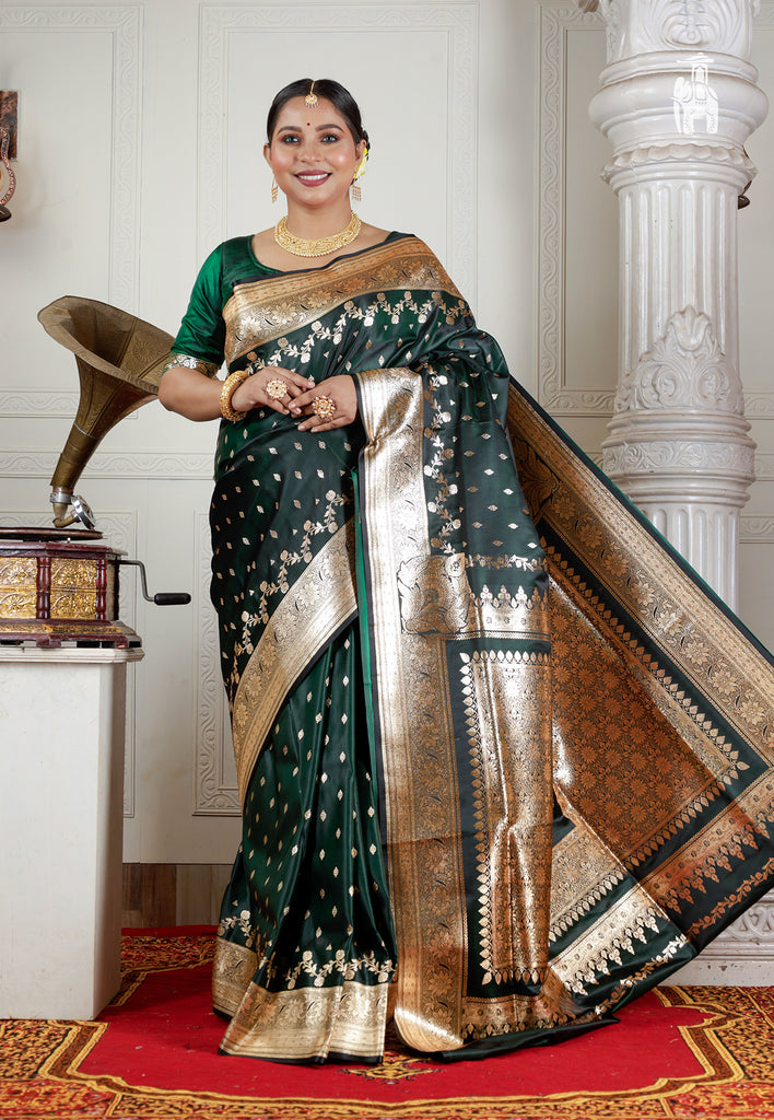 Curate the finest wedding appearance, wearing this lustrous Deep Green Satin Katan Banarasi Saree by Legacy of Bhojraj.