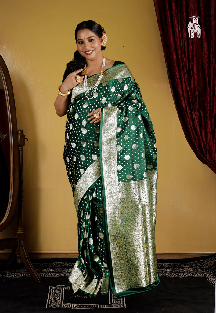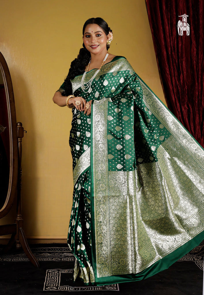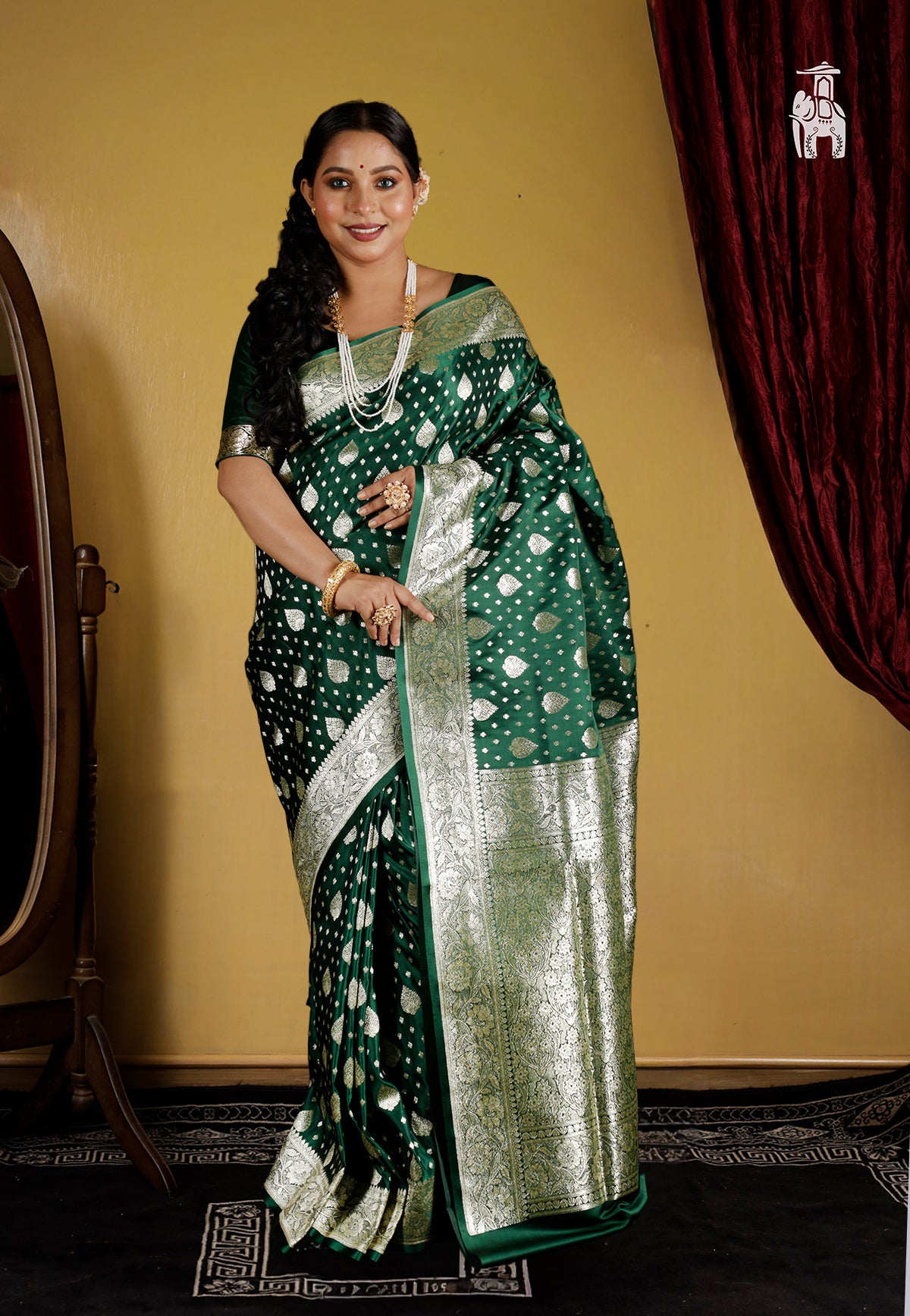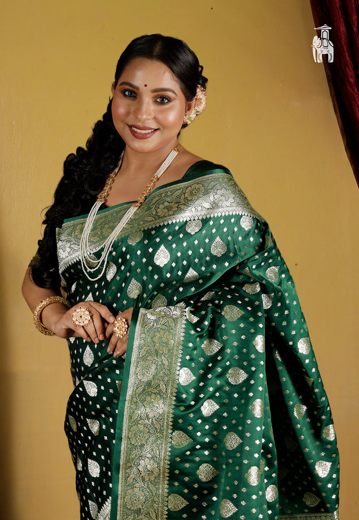 Crafted for bridal elegance, this Lush Green Satin Katan Banarasi Saree drapes you in a lustrous combination of Meenakari butis & hazari buttas.