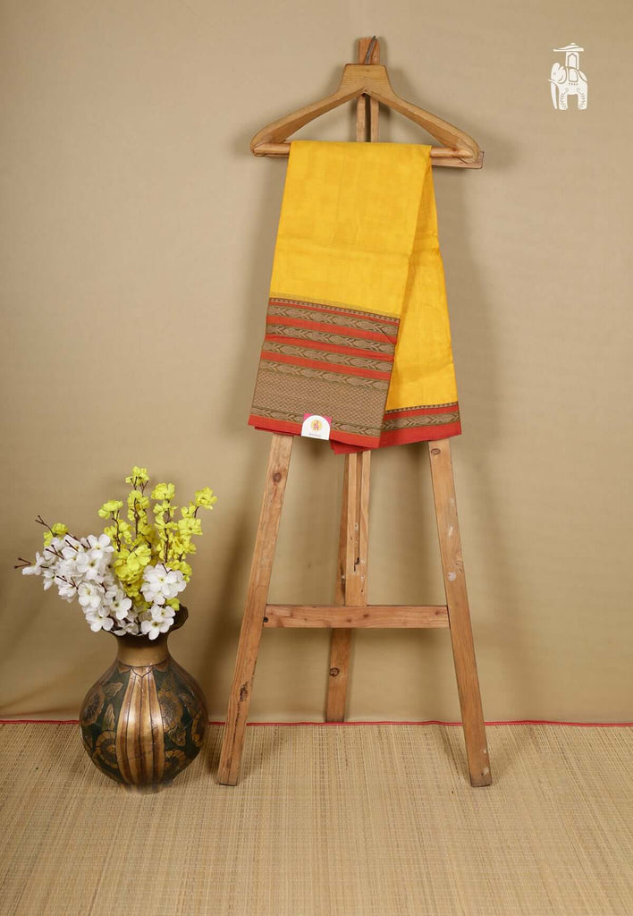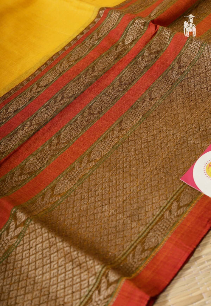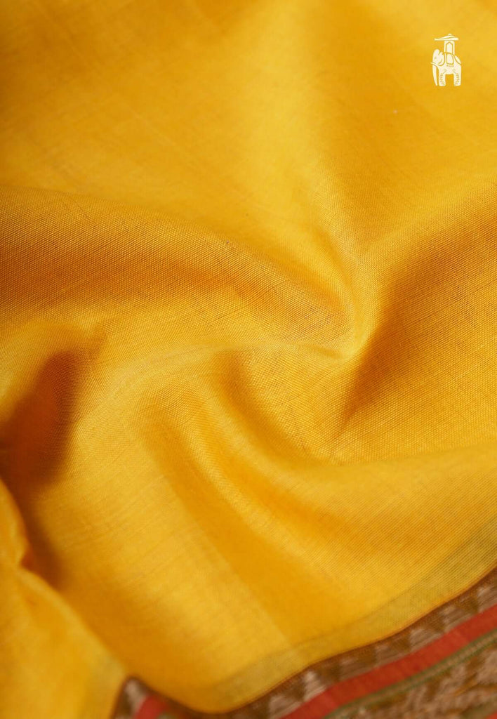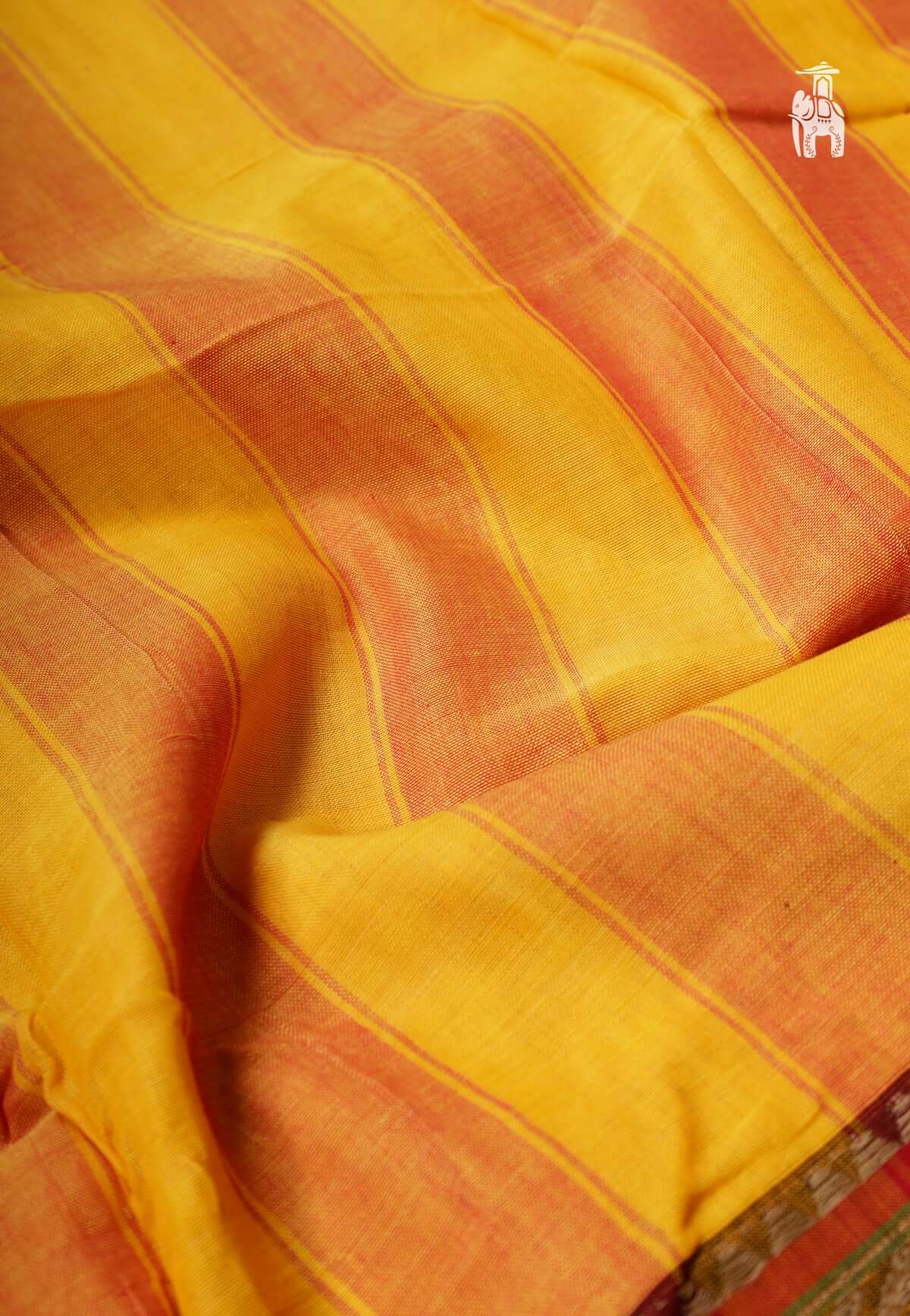 Flaunt your blissful festive spirit in this Mustard Yellow Narayanpet Cotton Saree with beautiful resham woven fish borders.