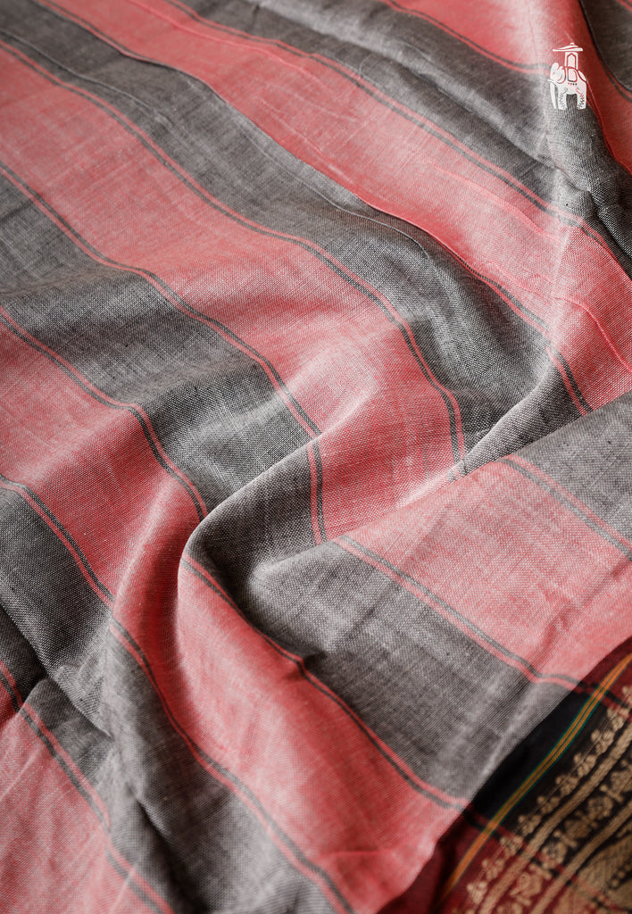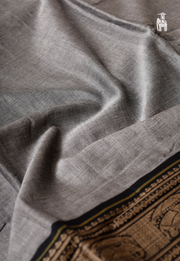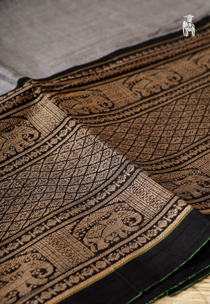 For special occasions in summer, get this brand new Smokey Grey Narayanpet Cotton Saree with ‘Royal elephant’ designs on its beautiful Black border.