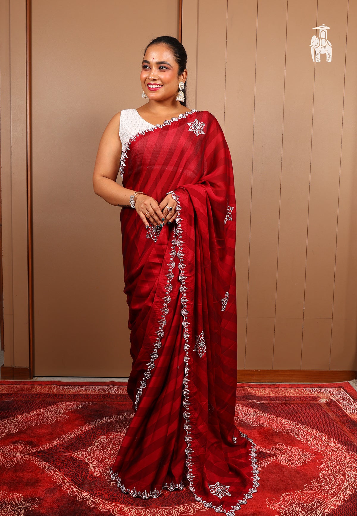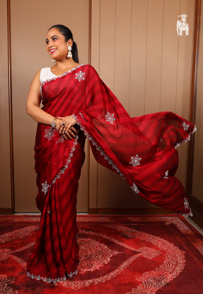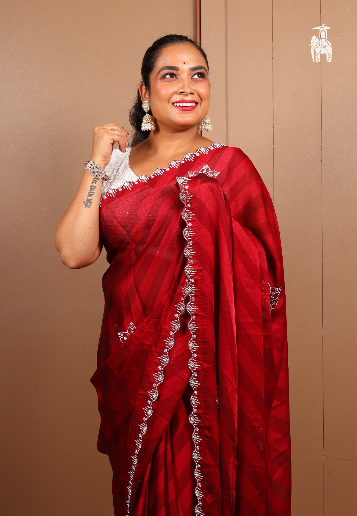 This Diwali, get ready in this gorgeous Apple Red Jimmy Choo Saree with leheriya patterns & dazzling stone work border.