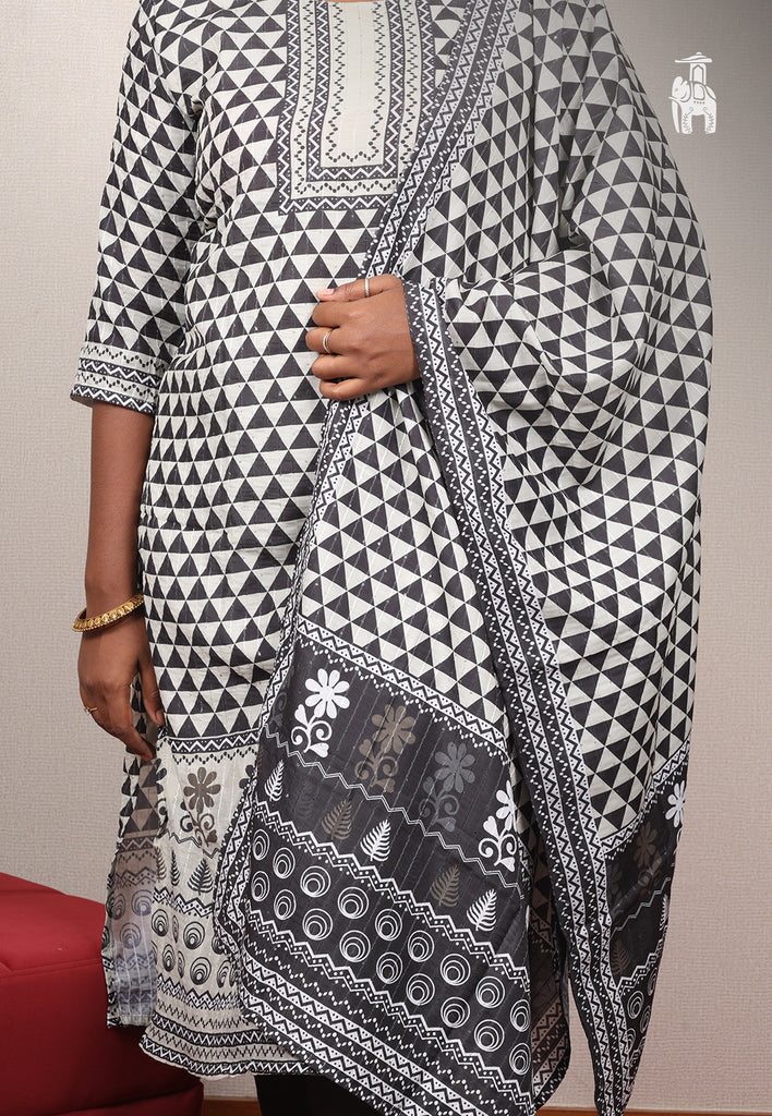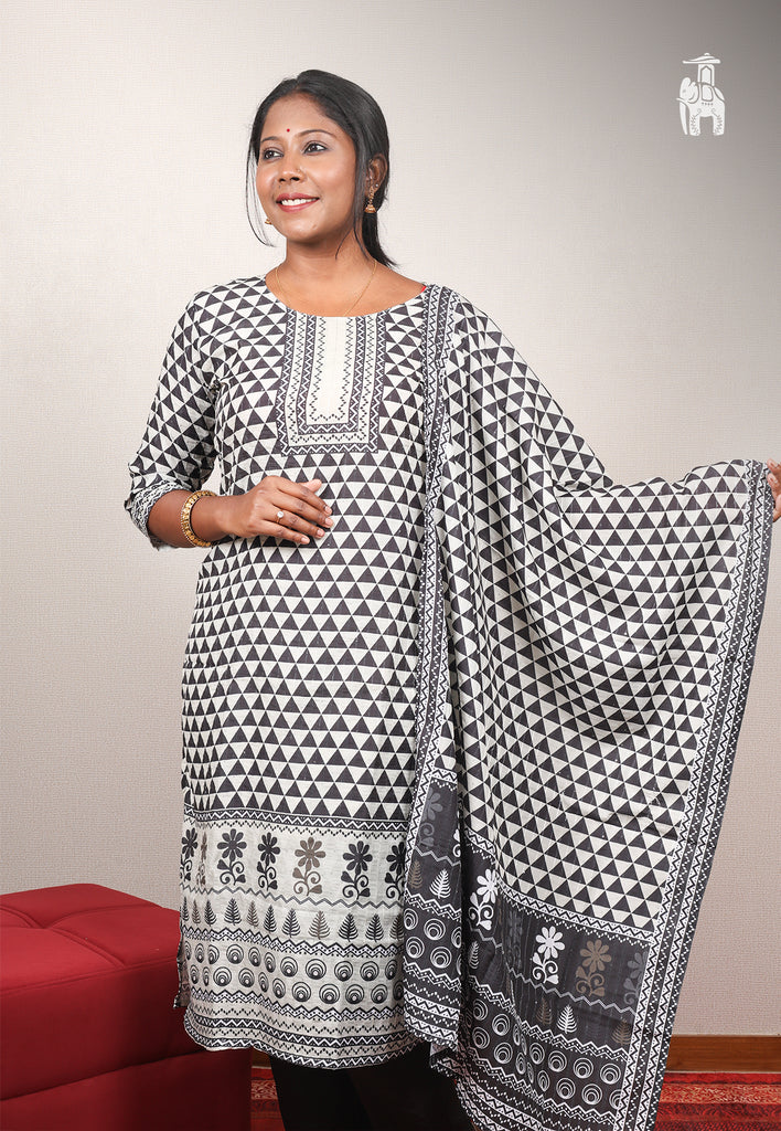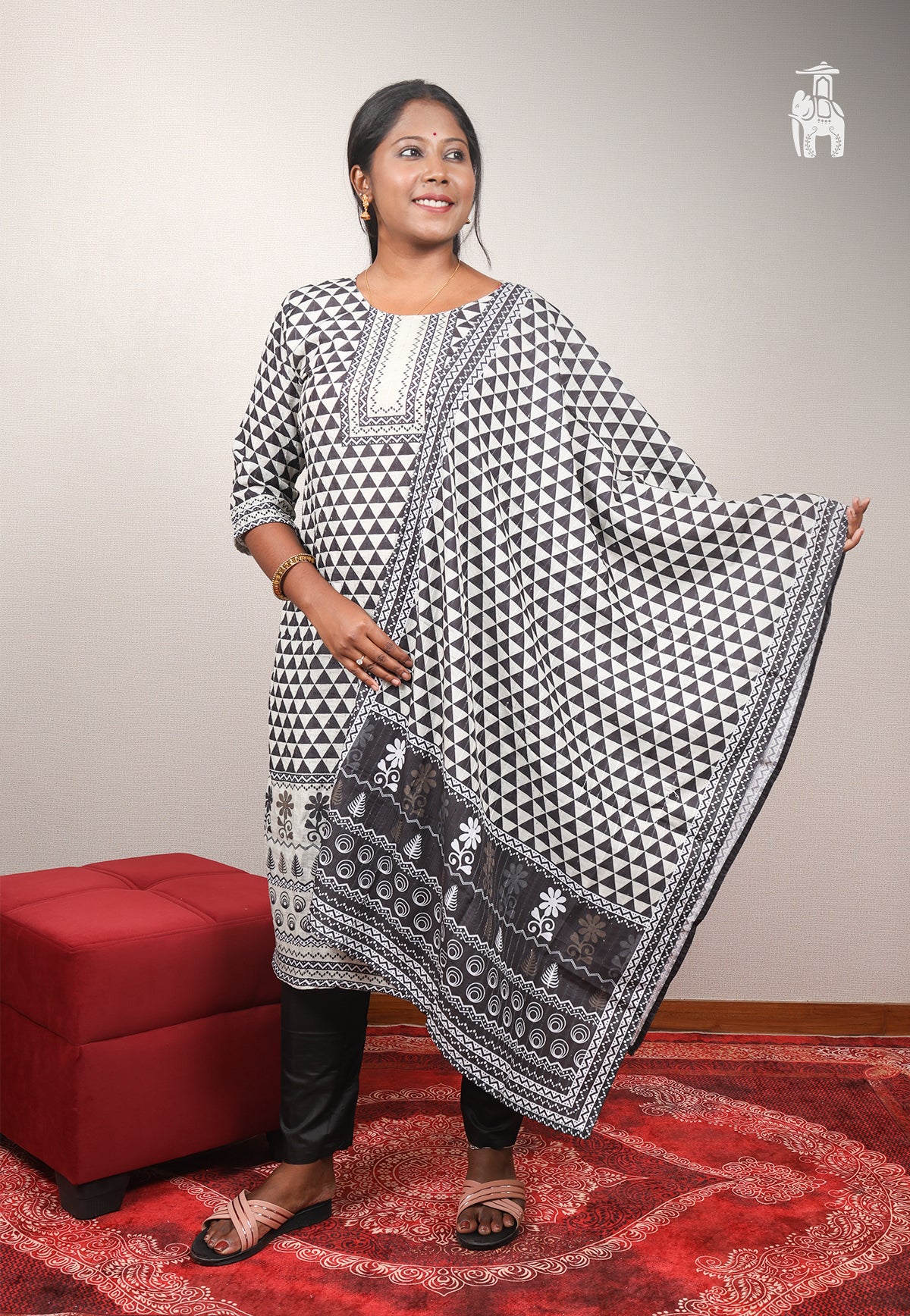 The airy & breathable straight fit kurta offers three-quarter sleeves, with a round neck style design. Dupatta comes with matching Black & White digital prints with your Kurta.