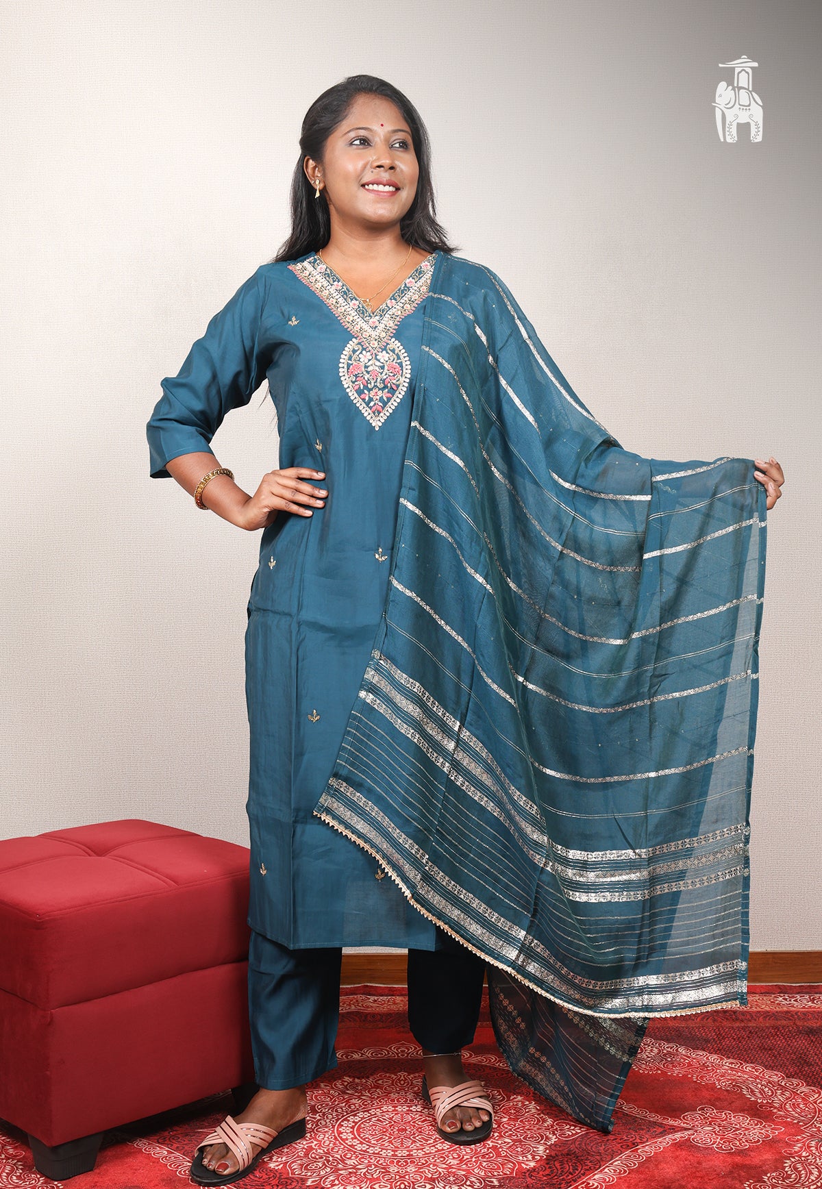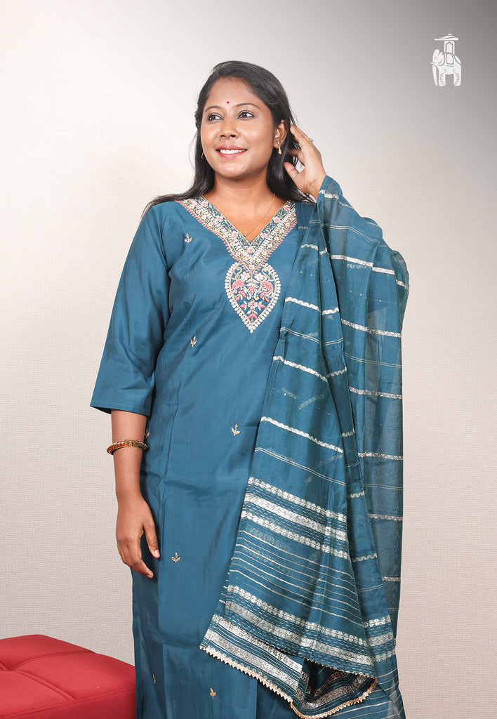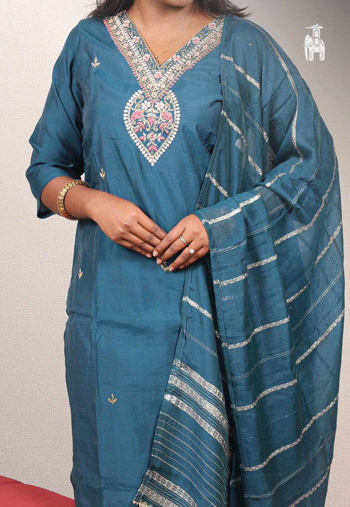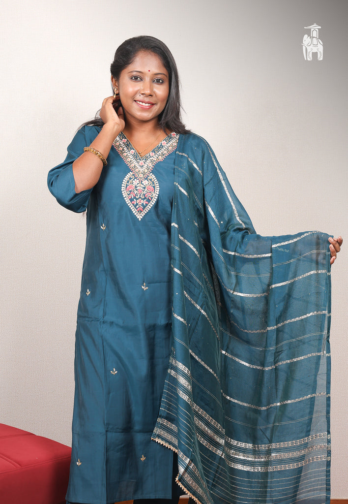 Style yourself in this latest Blue Suit Set by Legacy of Bhojraj. It’s a 3-piece Kurta set with a Dupatta, with three-quarter sleeves & a V-neck design.