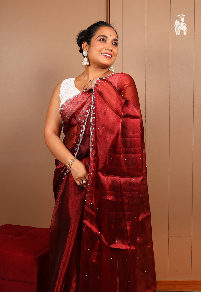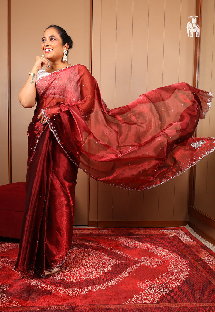 Gift yourself a Jimmy Choo Saree in this lovely shade of Crimson Red, & feel special in your special moments.