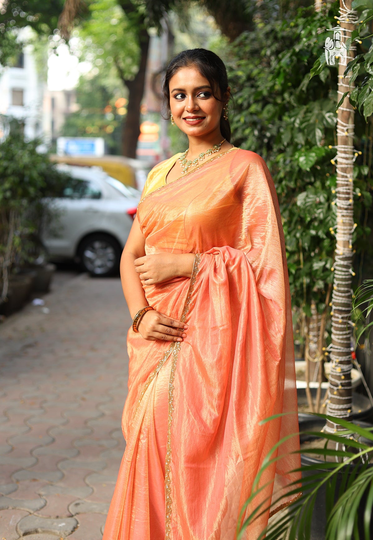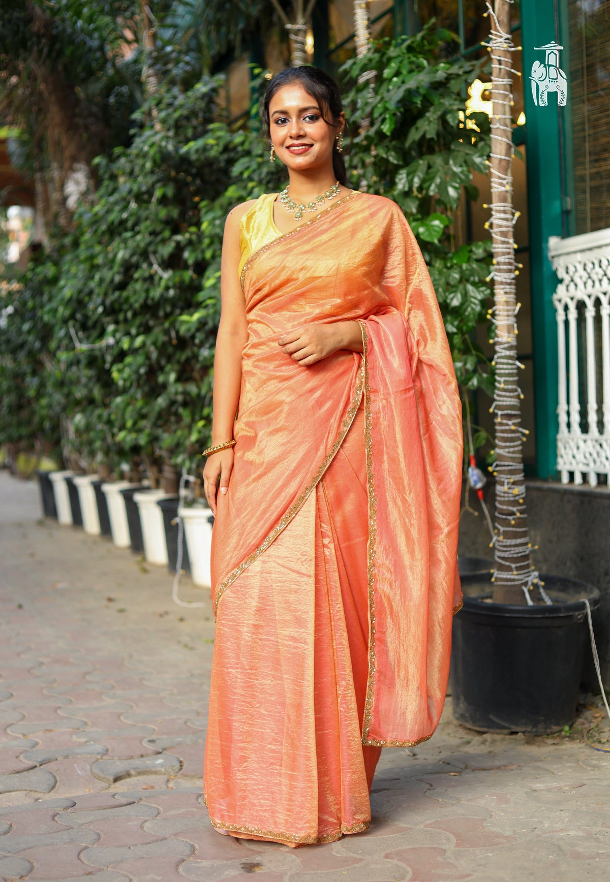 Hey, aesthetic lovers! Bringing to you this newly crafted Peach Orange Tissue Saree, crafted to perfection.