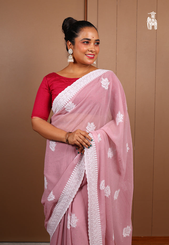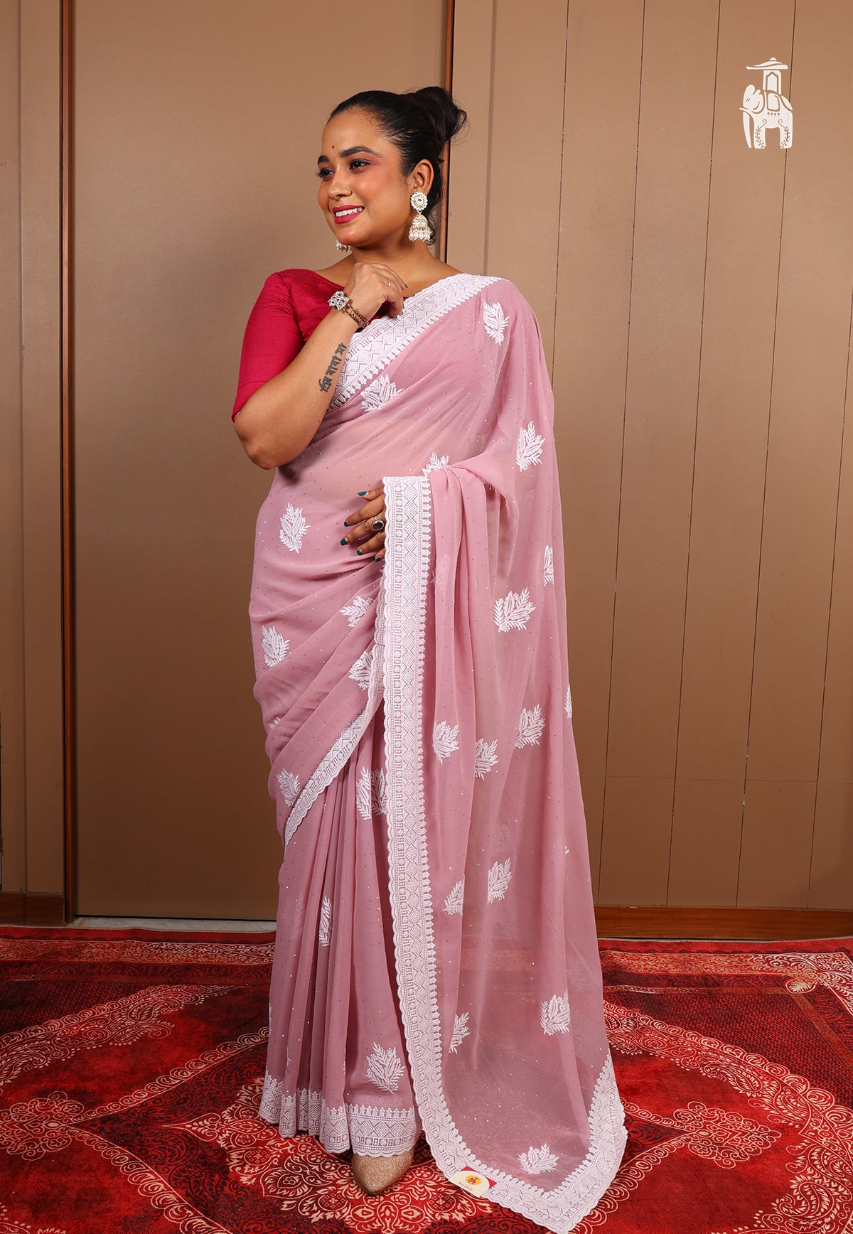 Saree comes with all-over Chikankari floral work, with stunning stone work, all over the Chiffon woven fabric.
