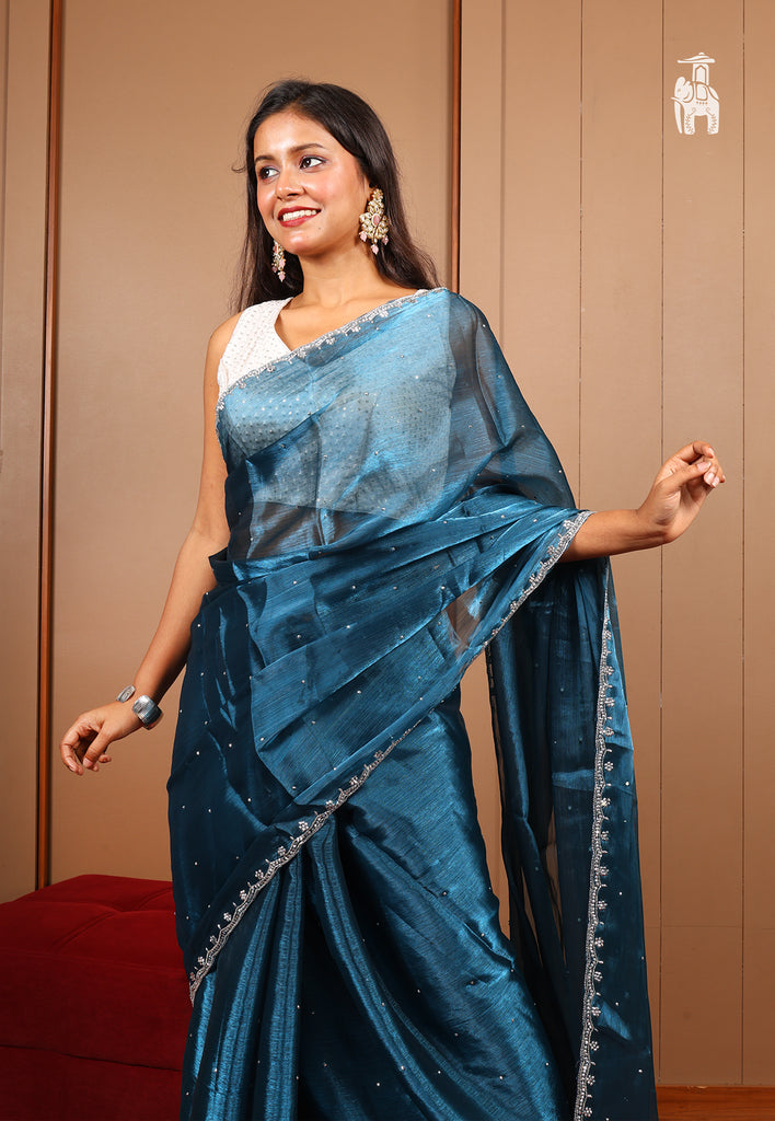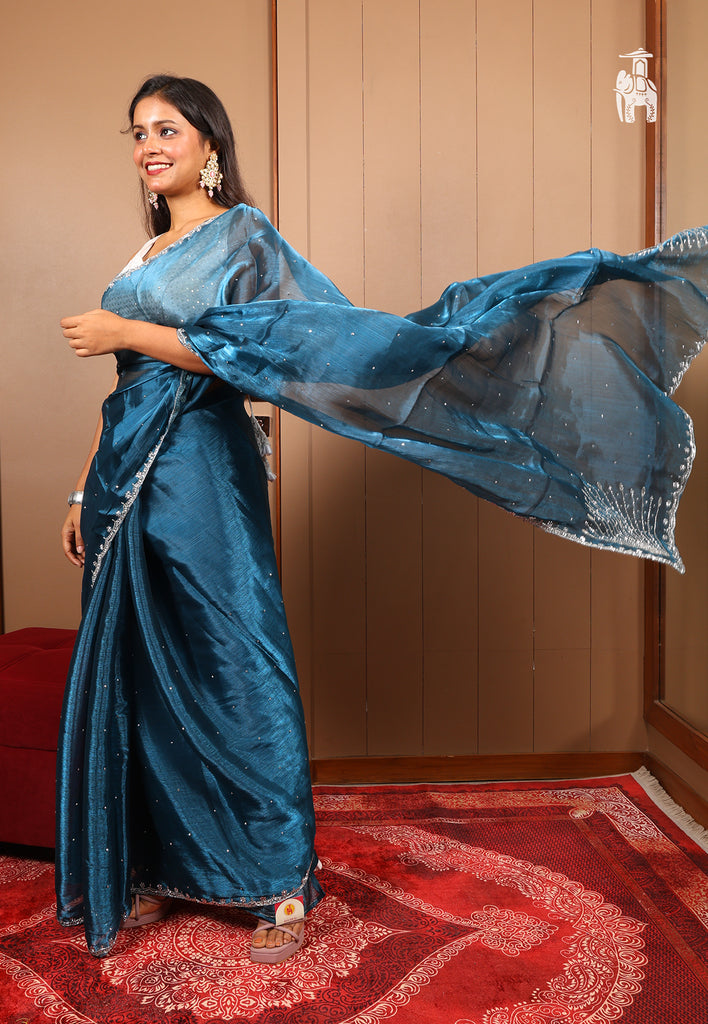 Feel the festive bliss, with this stunning Sea Blue Jimmy Choo Saree with all-over stone work, & a finest border.