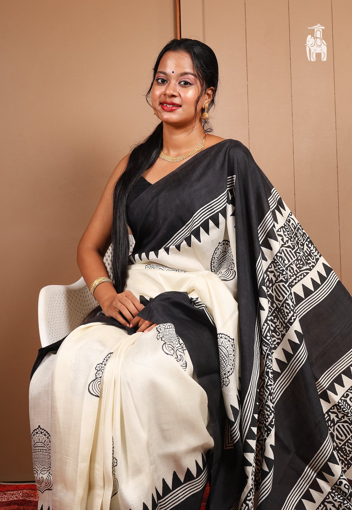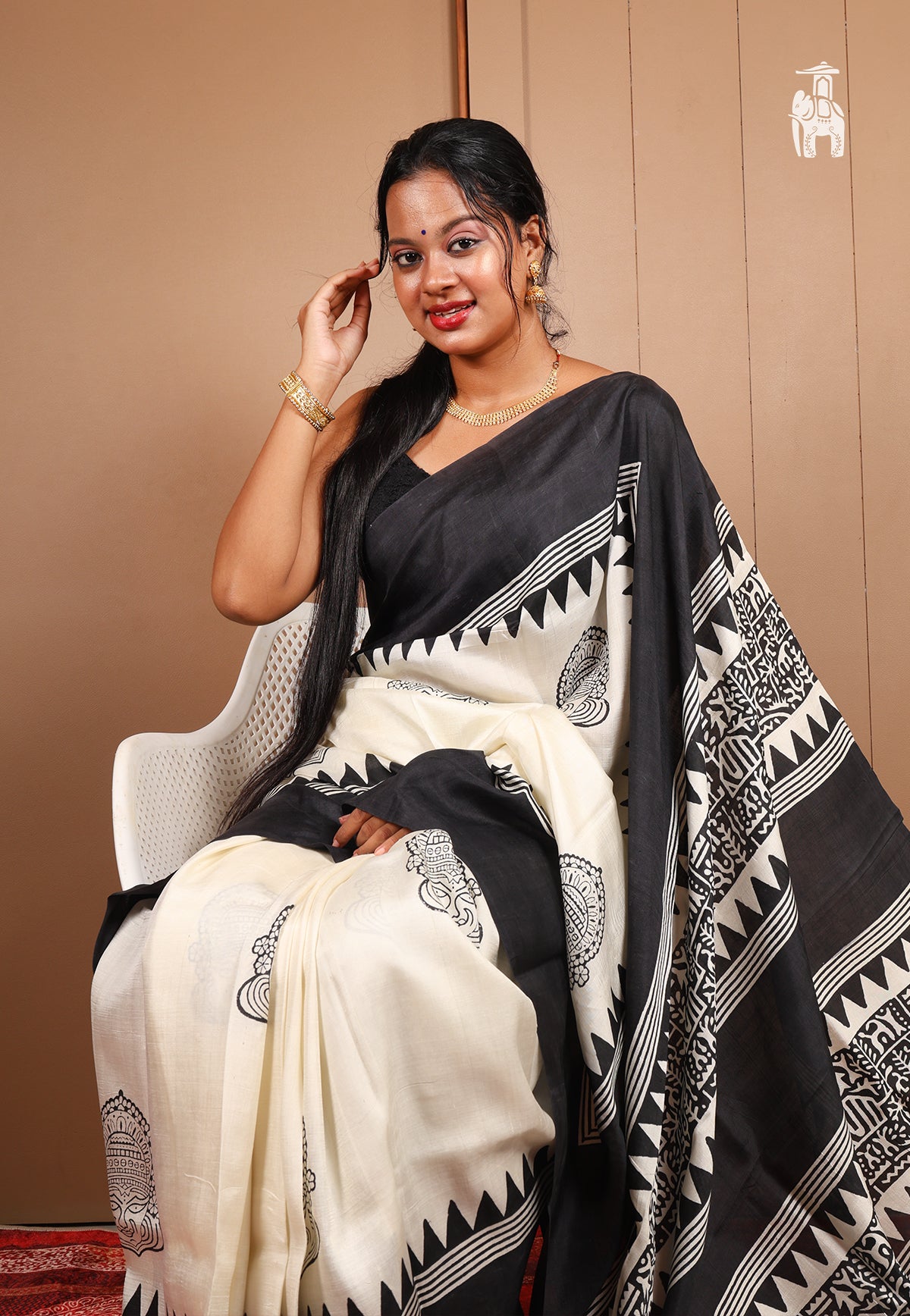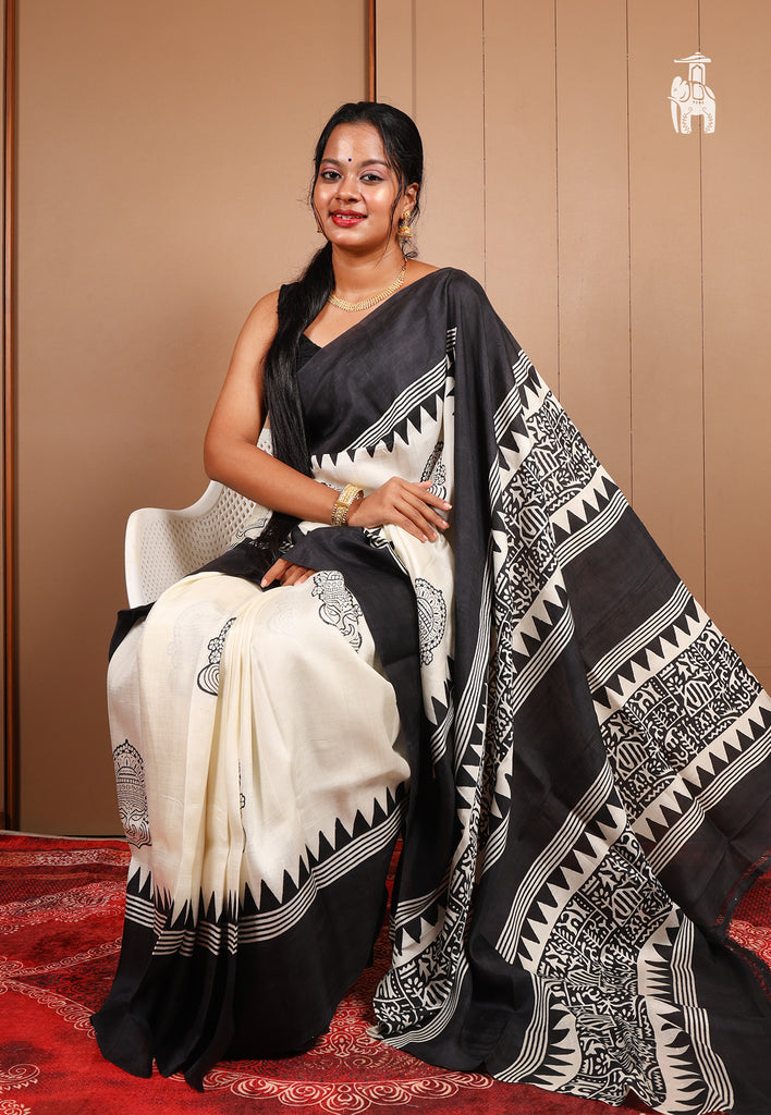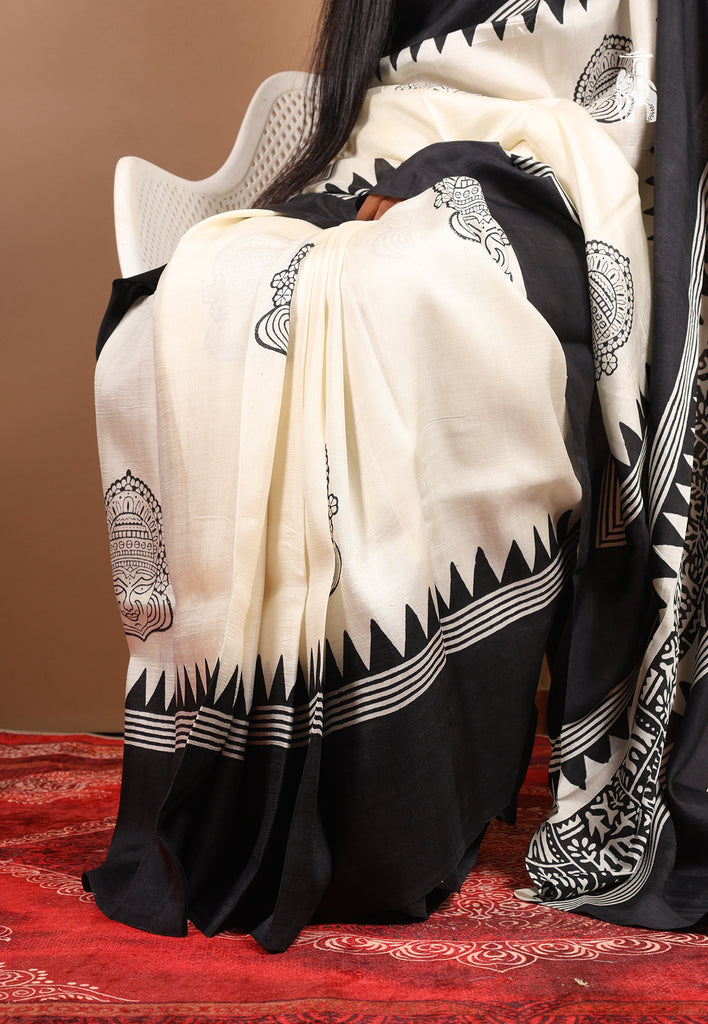 Steal all the limelight, in this premium Off White Printed Pure Murshidabad Silk Saree with Black border & cultural handblock prints.