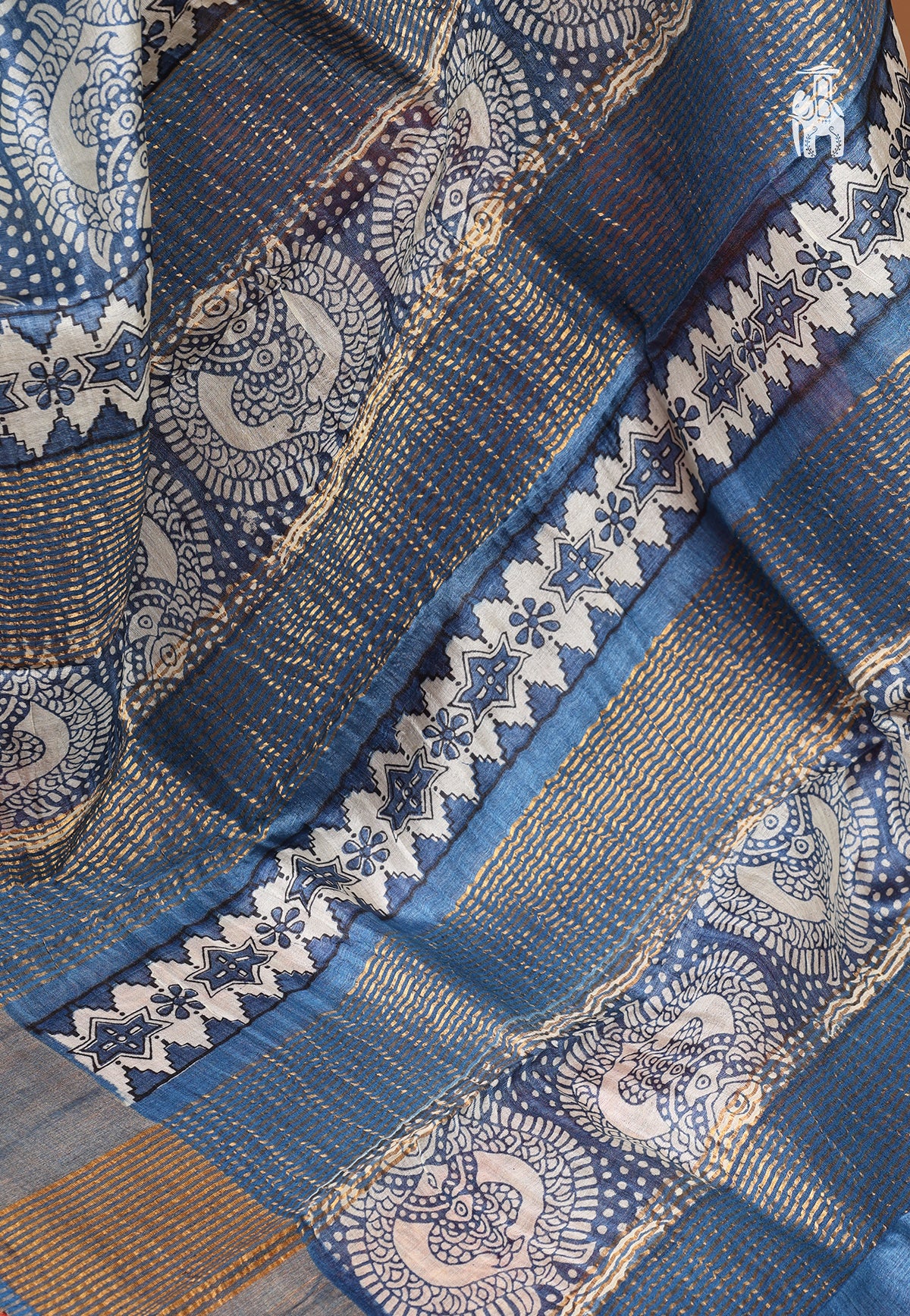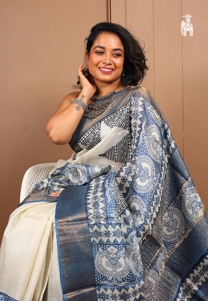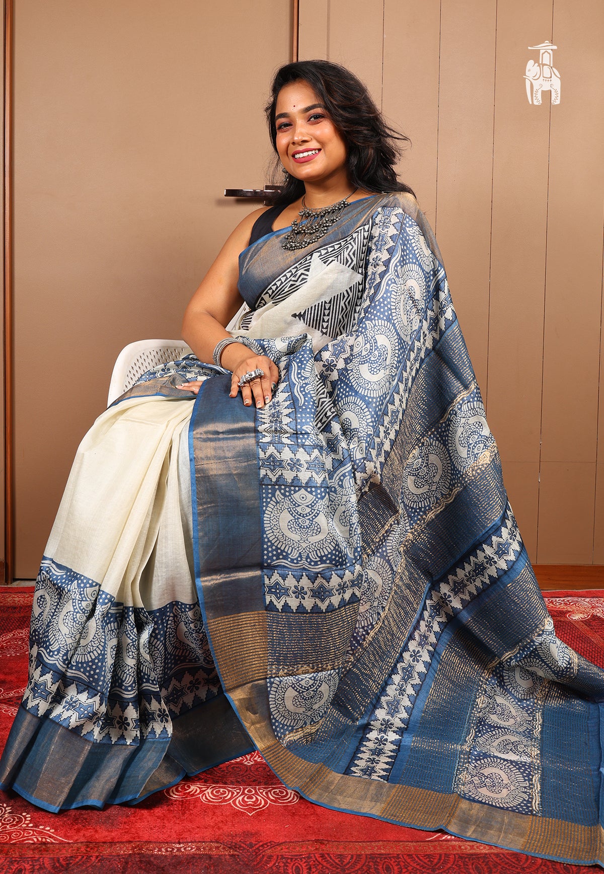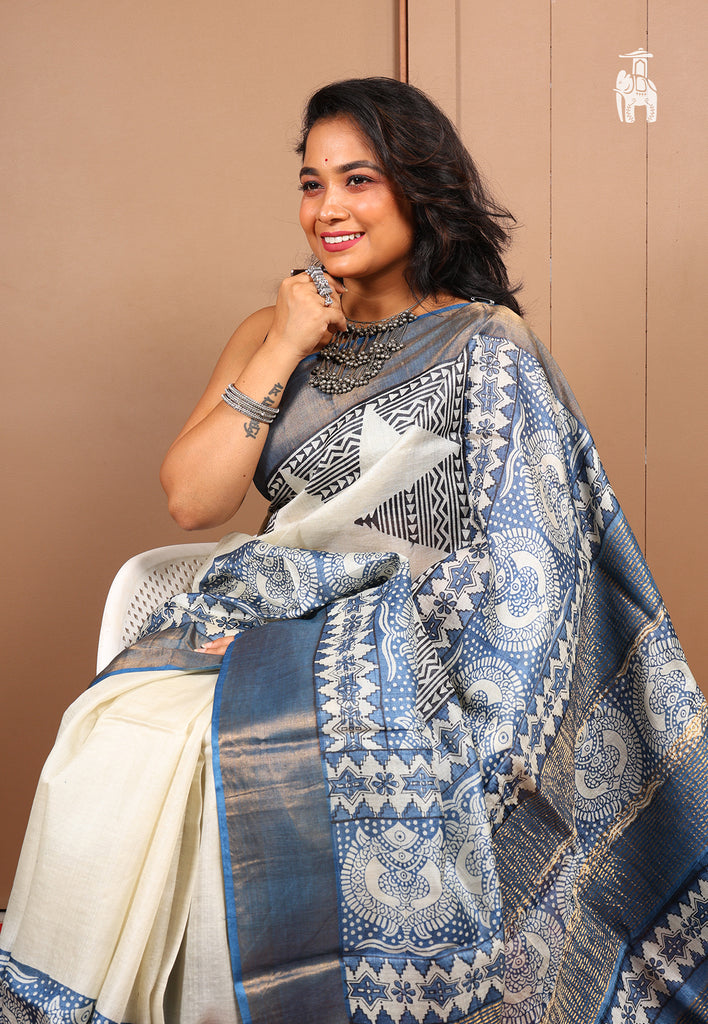Celebrate your festive energy in the luxurious smoothness of this Off White Printed Pure Tussar Silk Saree with handblock printed designs.