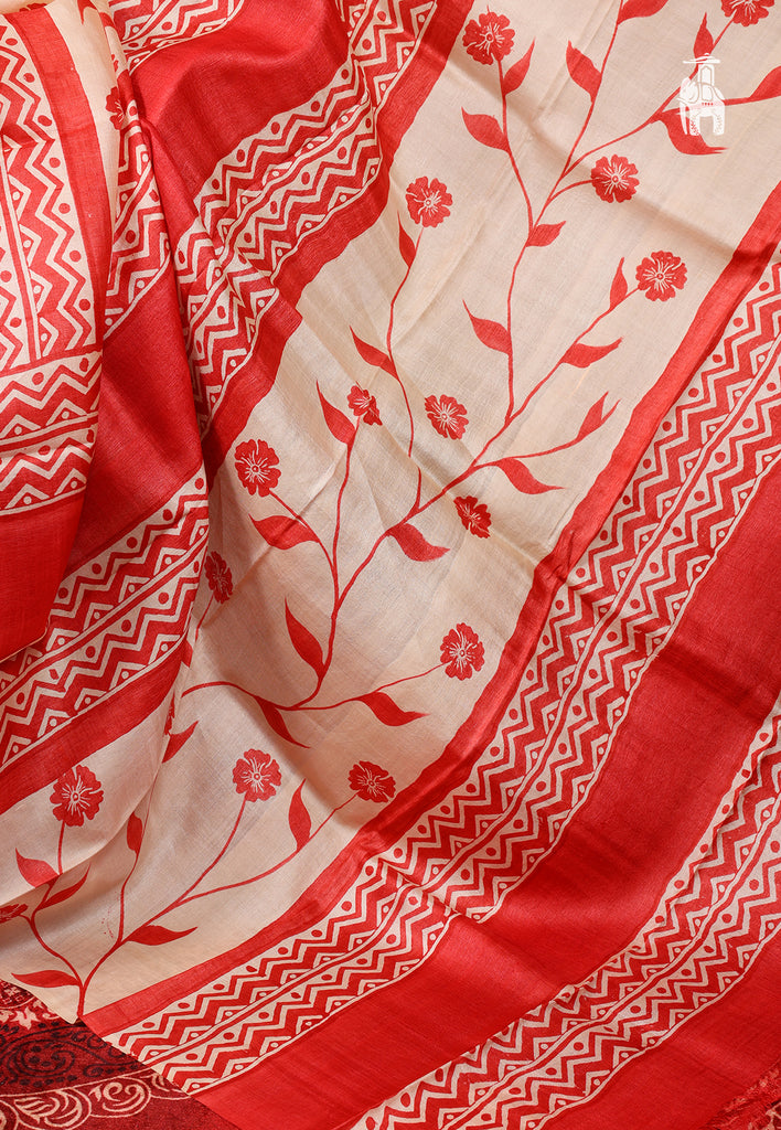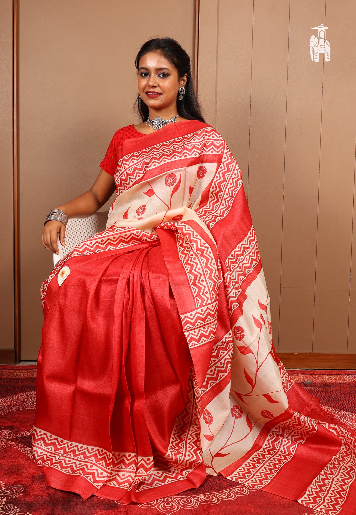 This Durga pujo, get ready in this Bhojraj special Red Printed Pure Tussar Silk Saree, to grab compliments for your festive outfit.