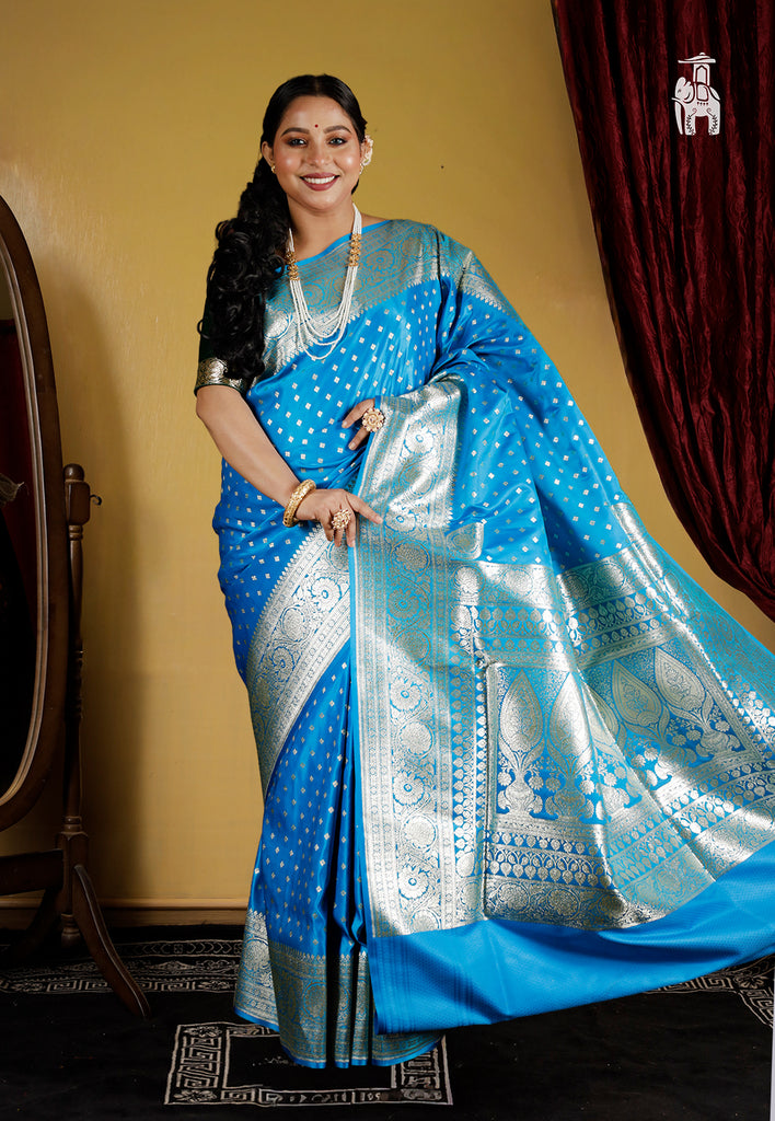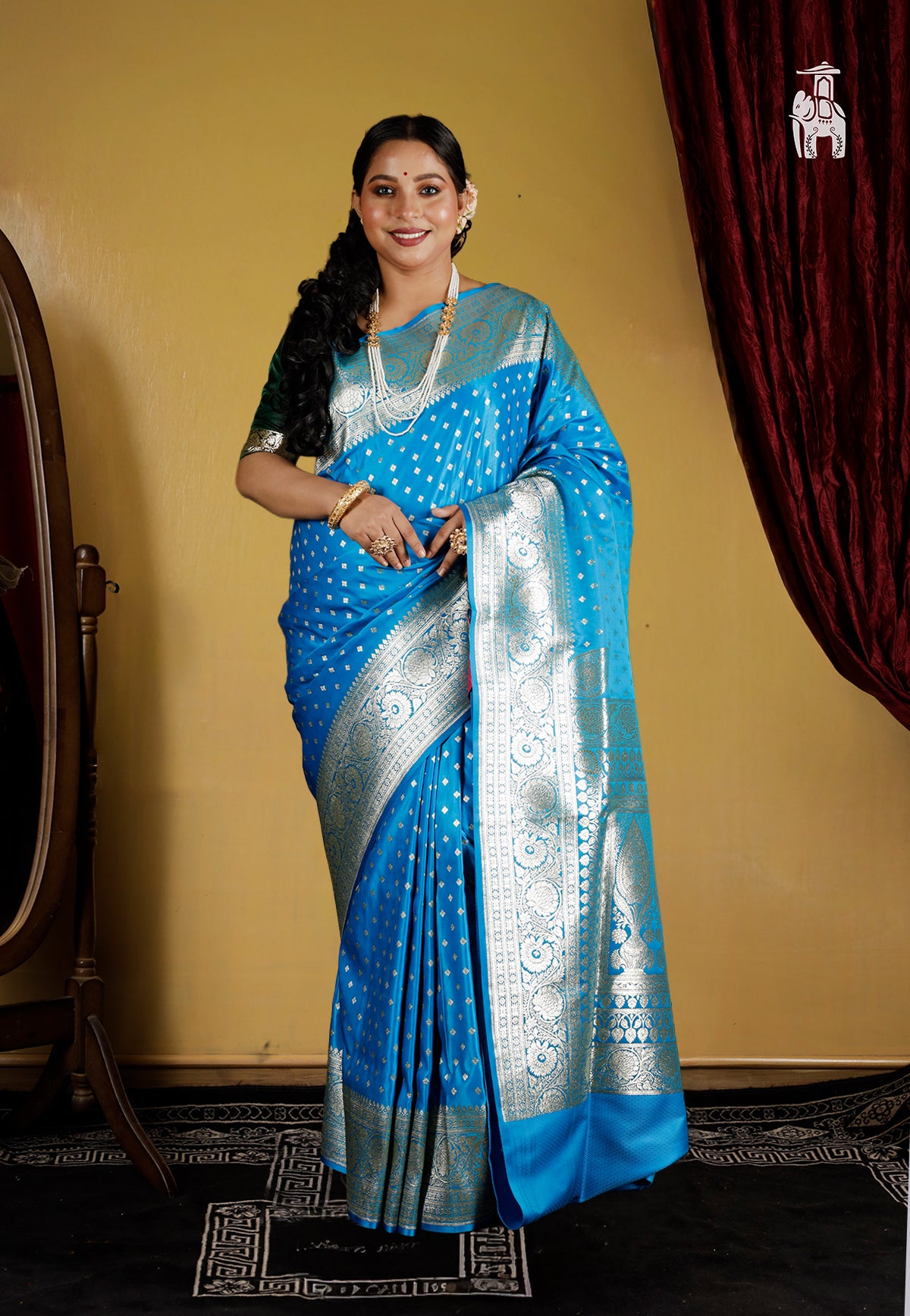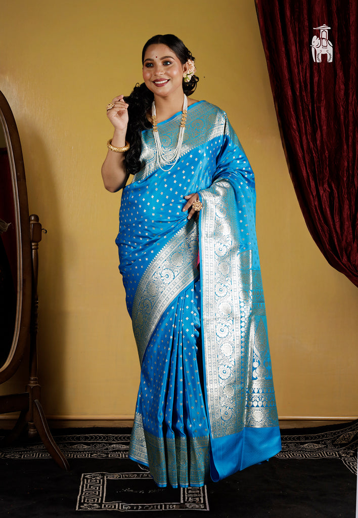 Warm, luxurious & pretty! This Blue Satin Katan Banarasi Saree is a dream for newlywed brides & all brides-to-be.