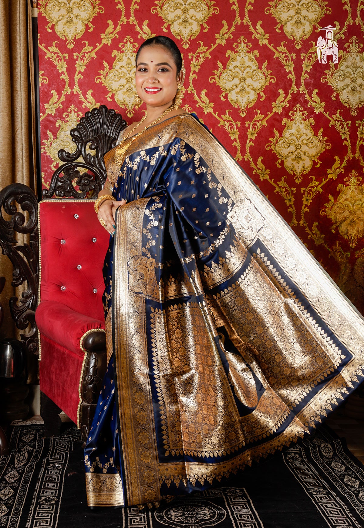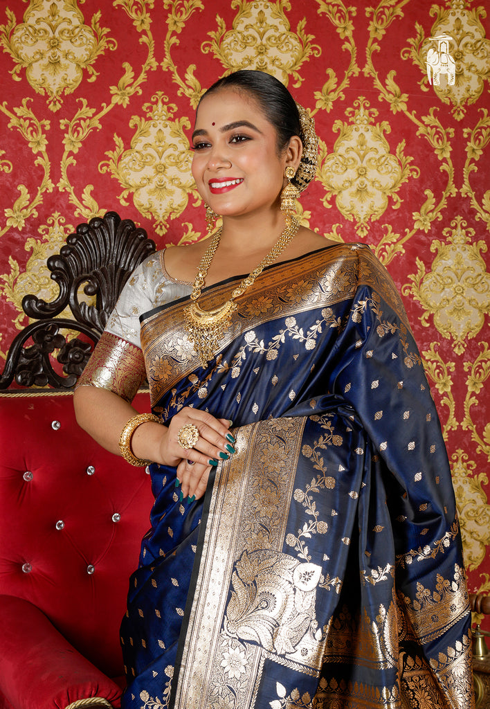 Celebrate your Sangeet look in this lustrous Deep Blue Satin Katan Banarasi Saree with a truly rich floral zari border.