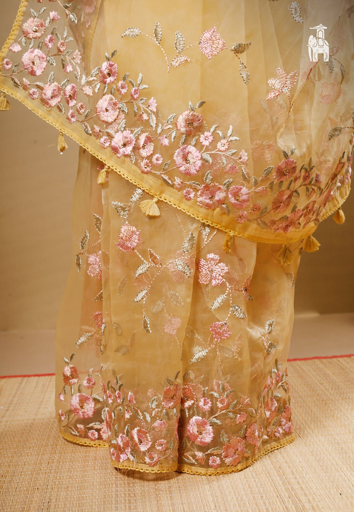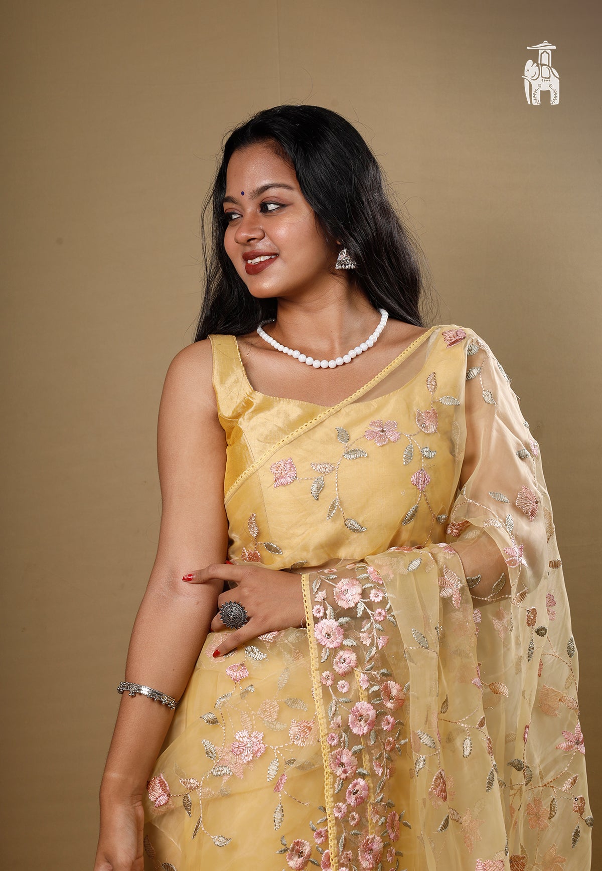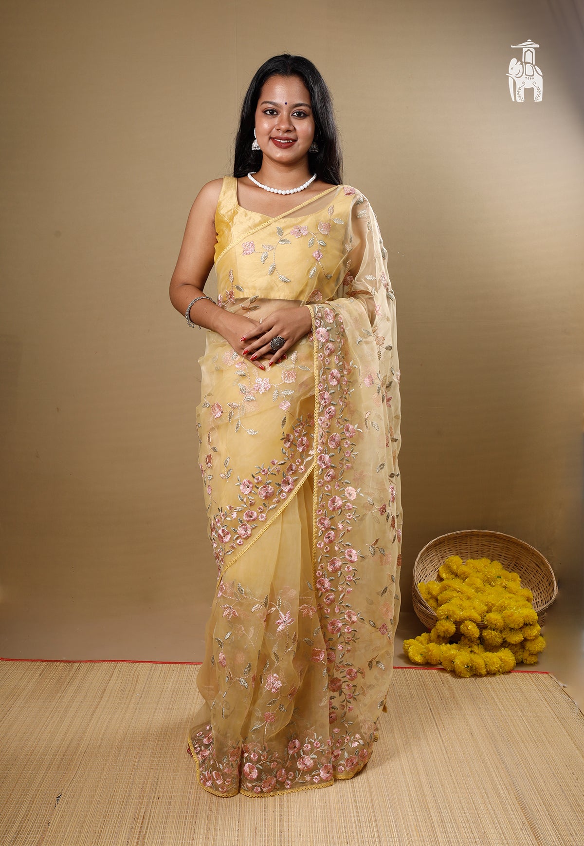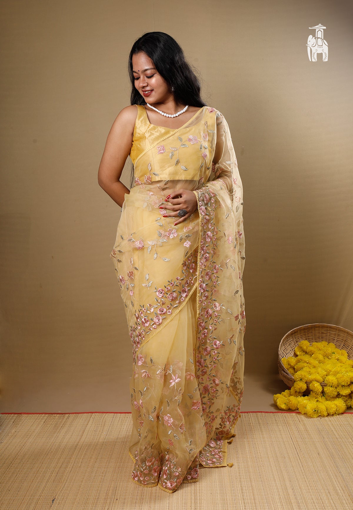 When it’s you-time, it has to be special! So get best dressed in this Pastel Yellow Floral Organza Saree, which features floral embroidery.