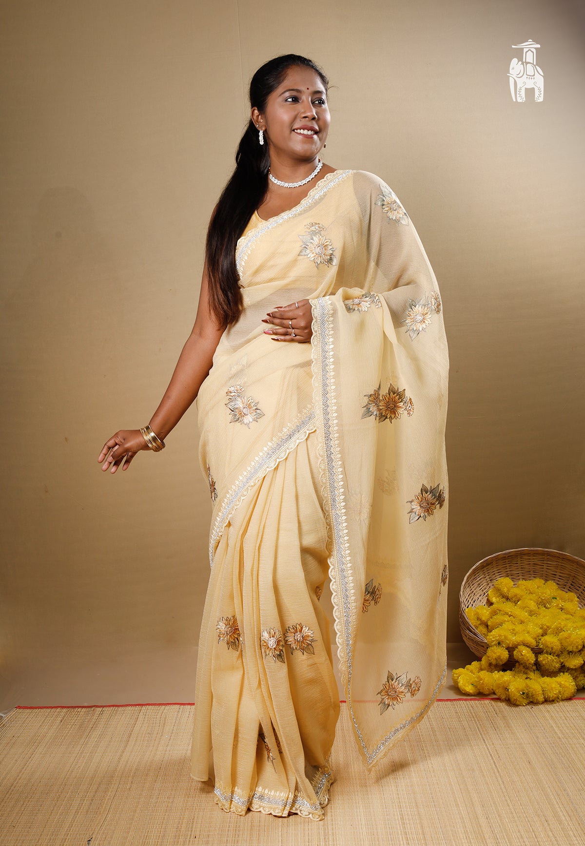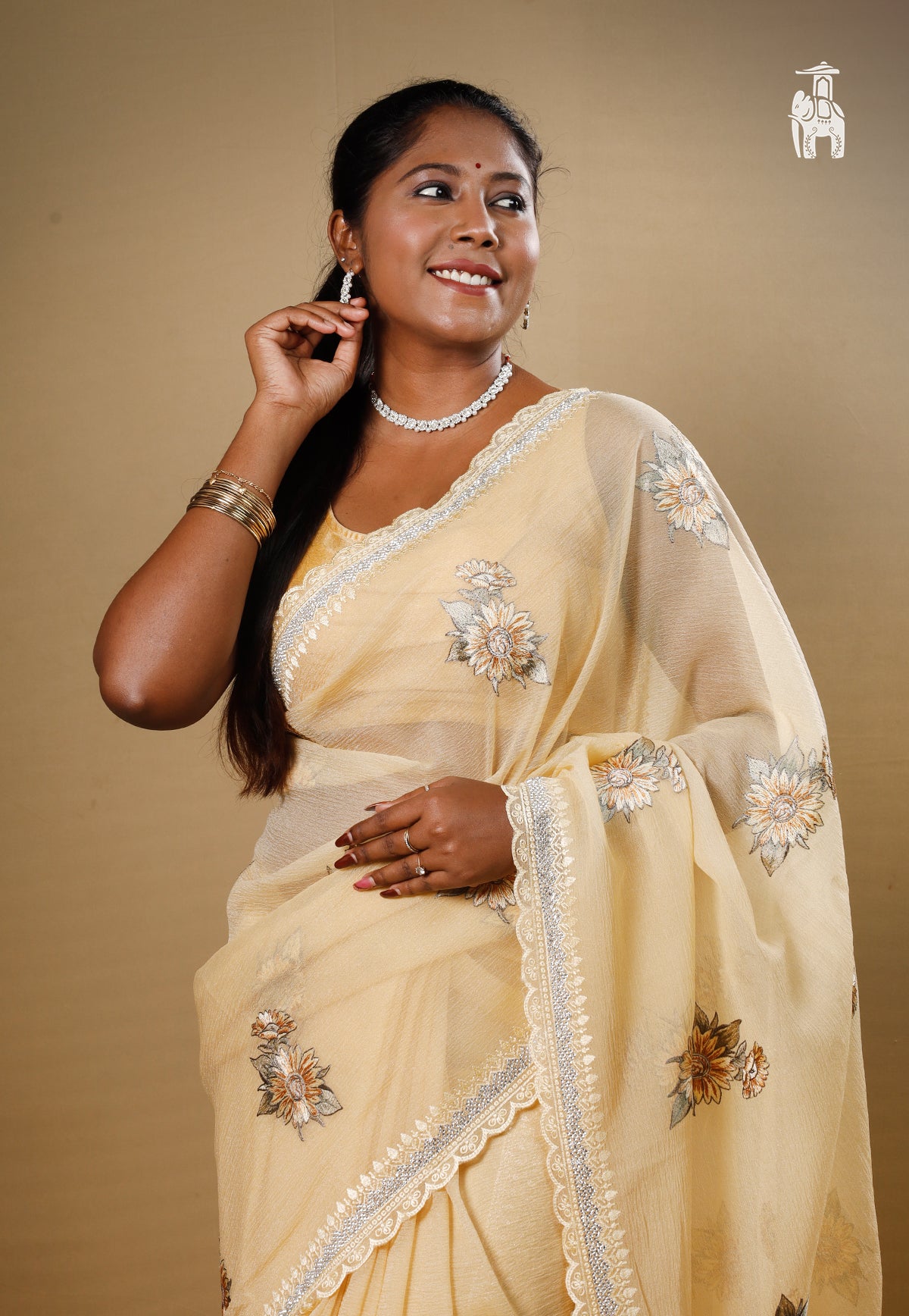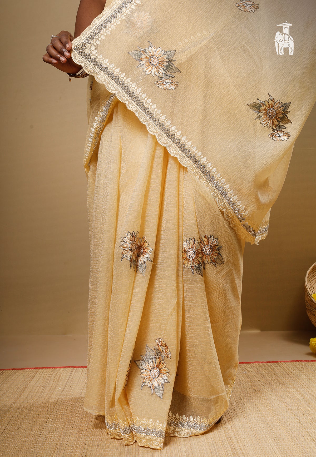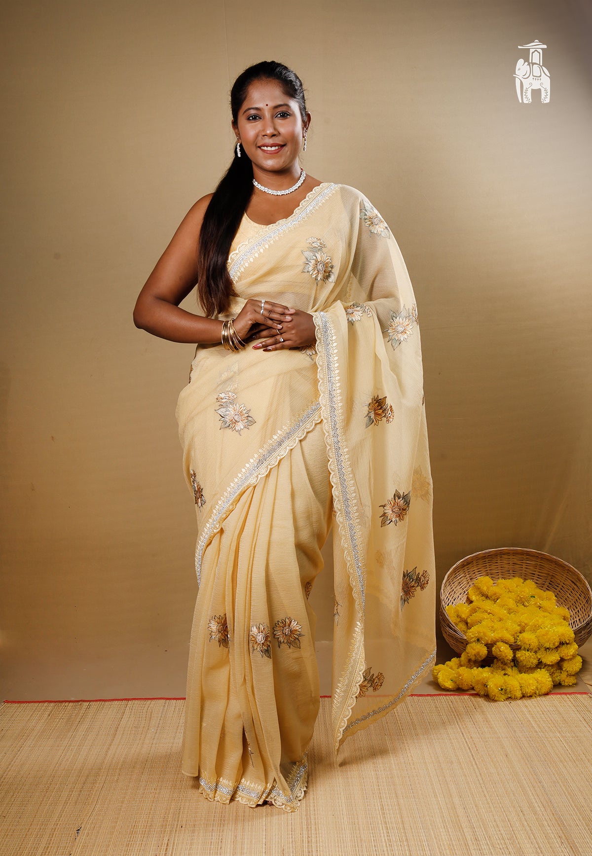 Celebrate your personality in this stunning Yellow Floral Chiffon Saree with intricate floral designs, crafted for your special moments.
