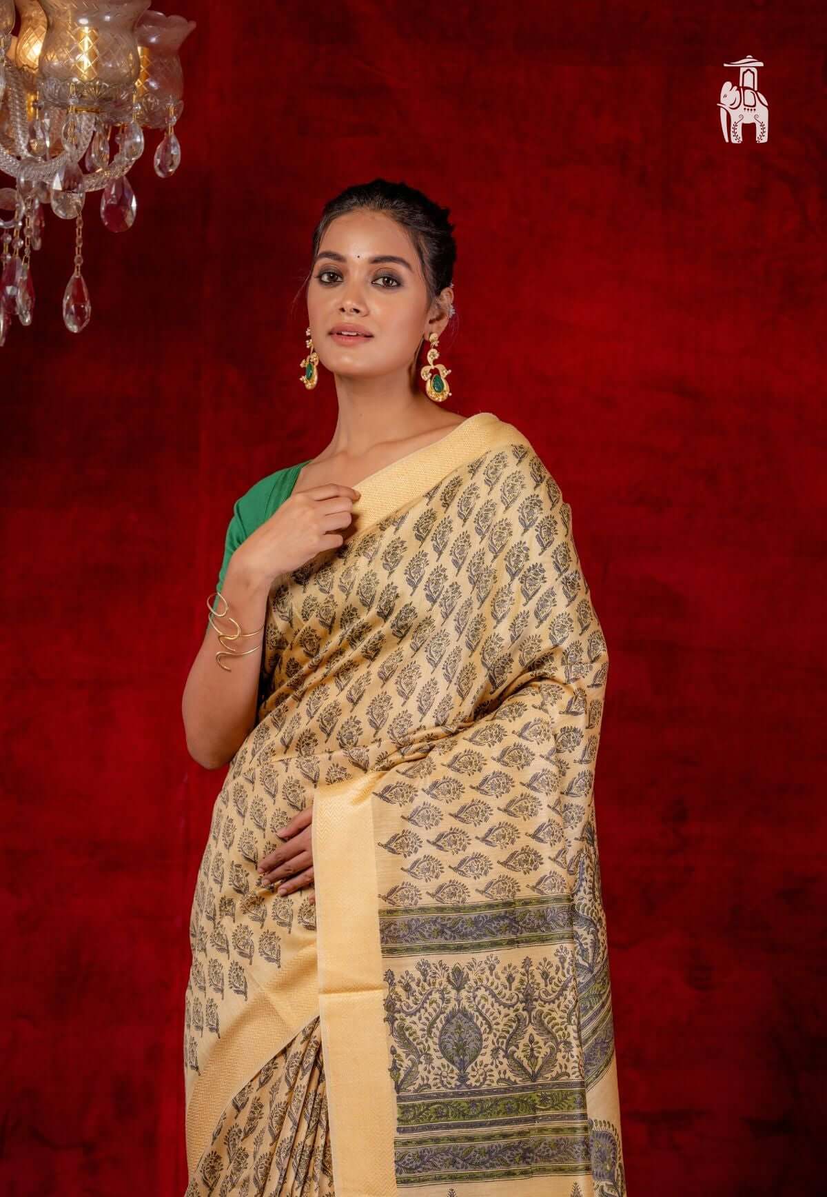 Invited to a social gathering? Drape this gorgeous Beige Printed Tussar Silk Saree with handblock printed bagh designs.