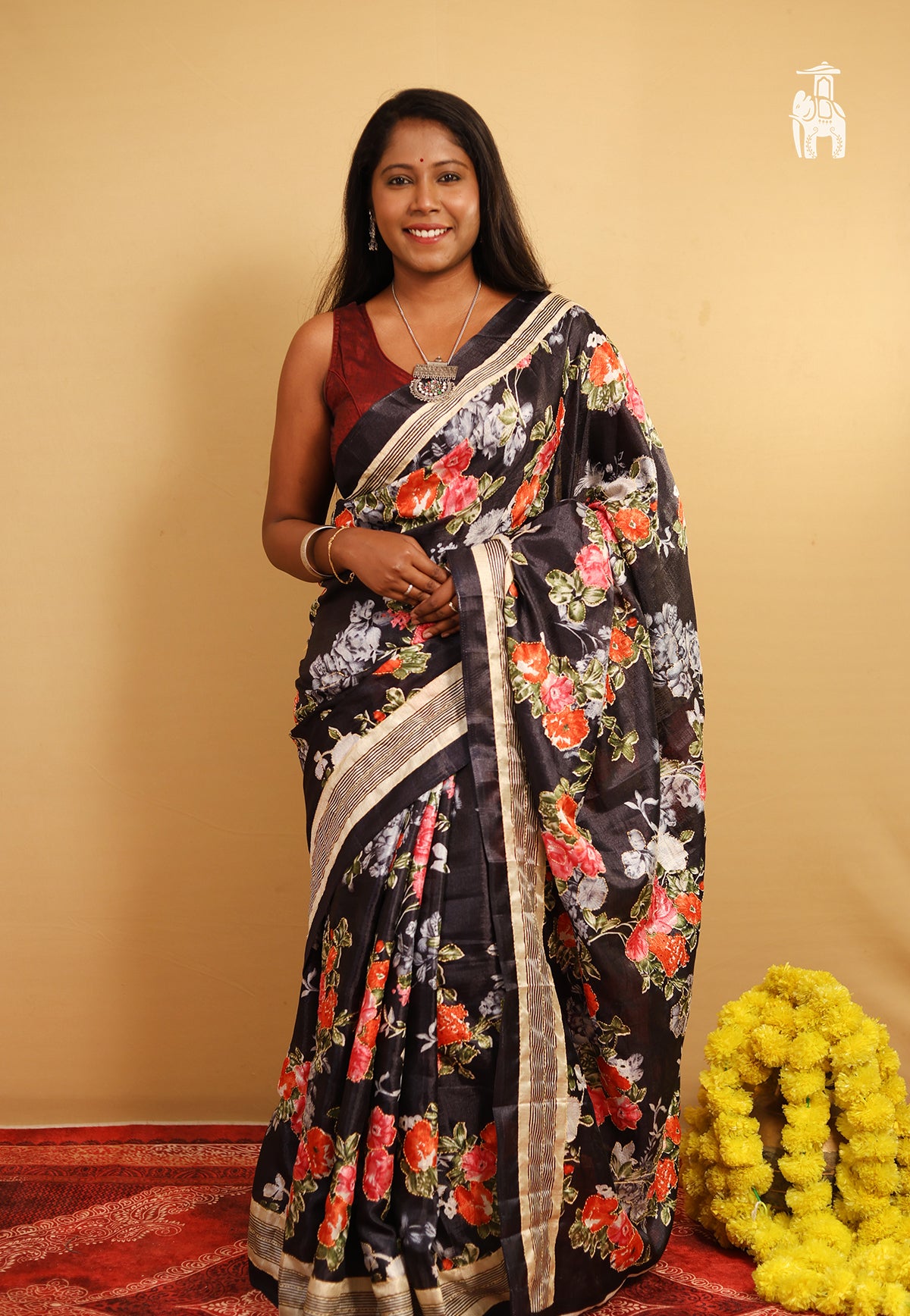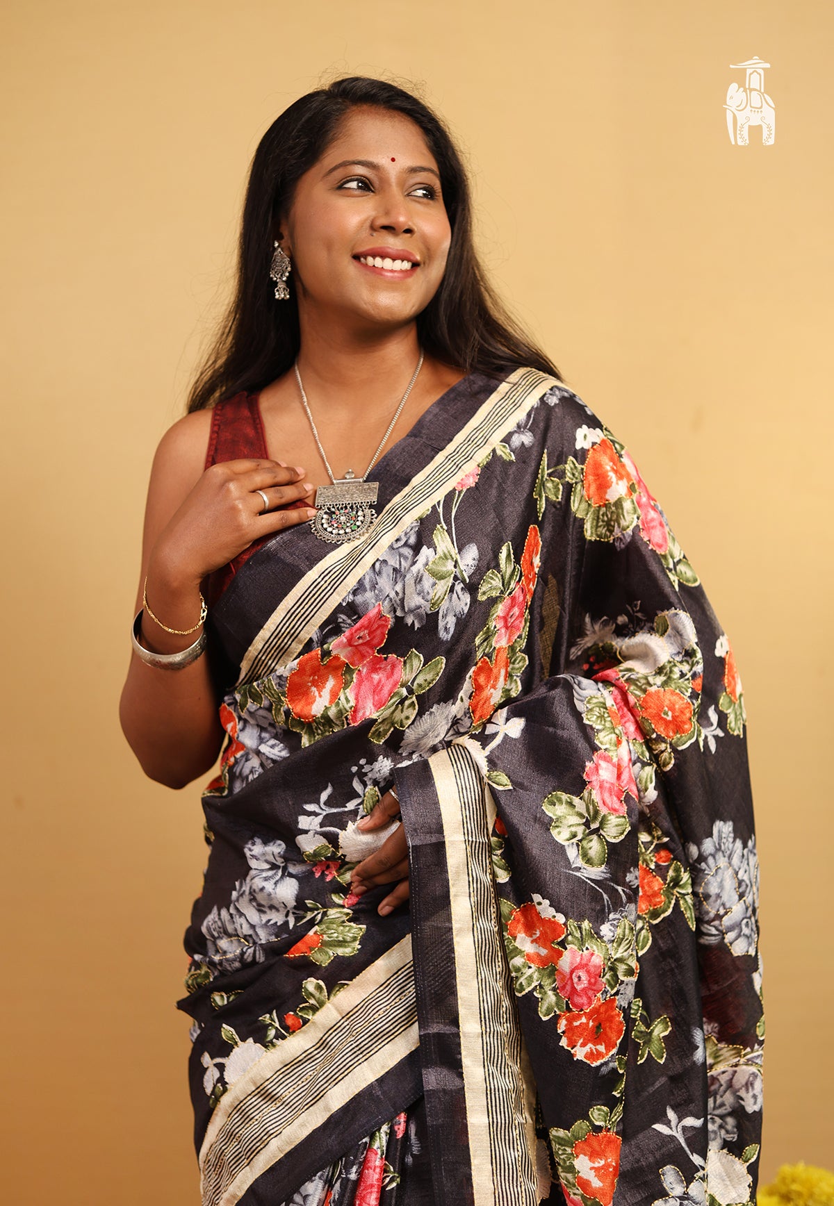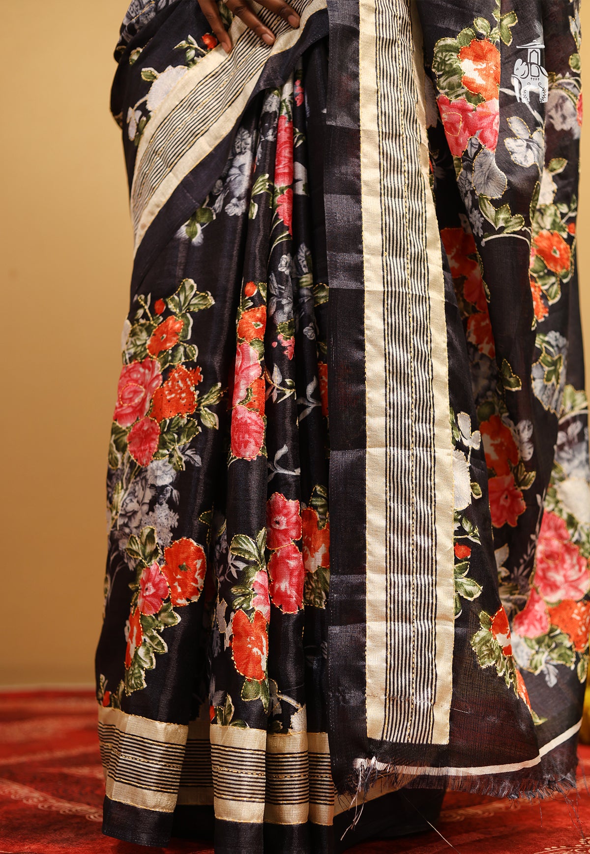 It’s your dinner date or a weekend plan, this Black Matka Silk Saree with vibrant floral designs is a perfect choice for these events.