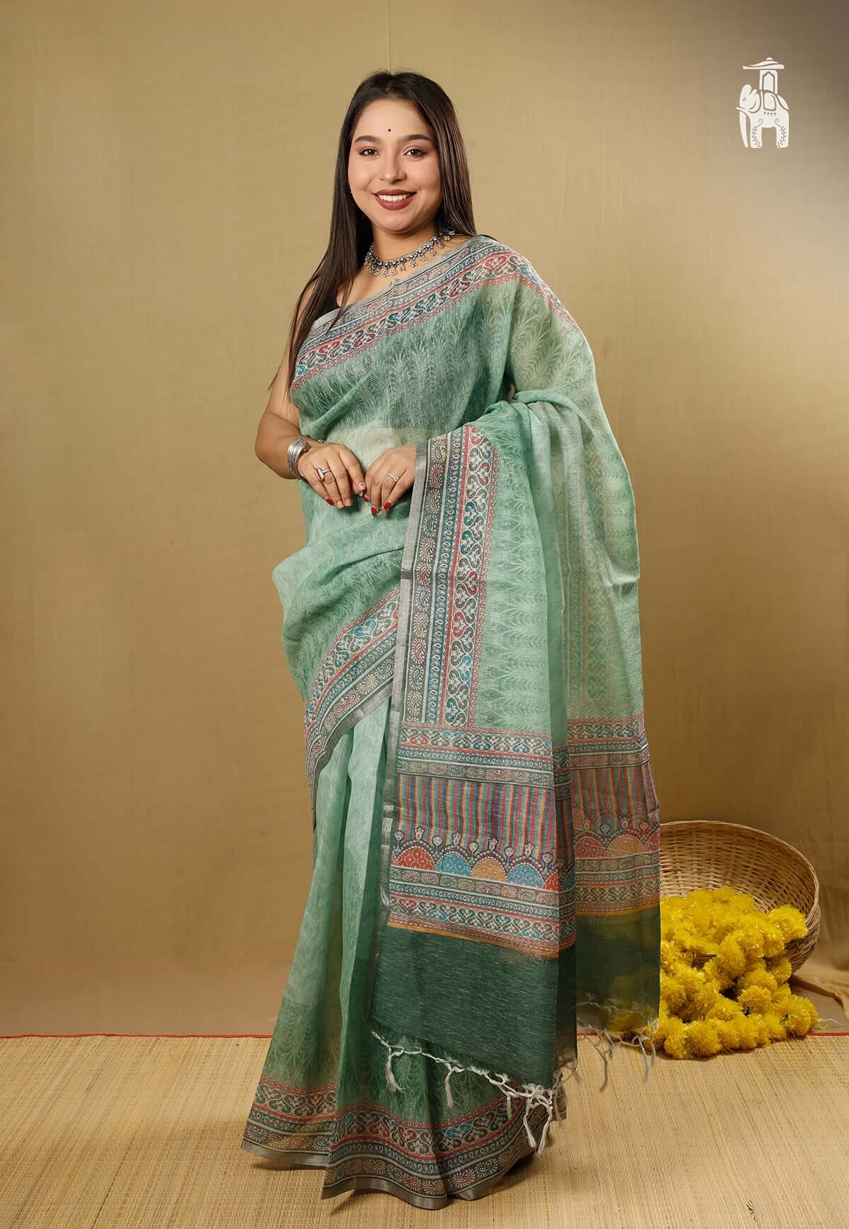 It’s high time to avail this Green Linen Tissue Saree with a digitally printed beautiful border.